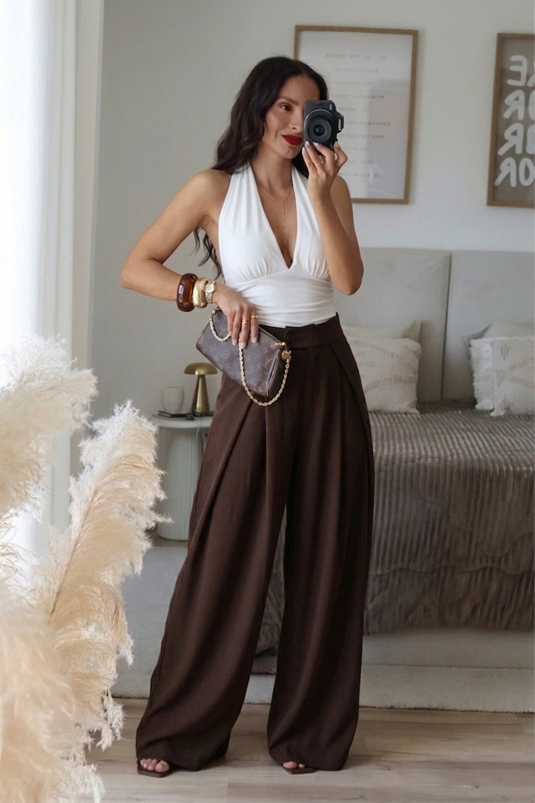 Wide leg tailoring trousers with belt loops. They fit super well. They have pockets and an elasticated waistband at the back.