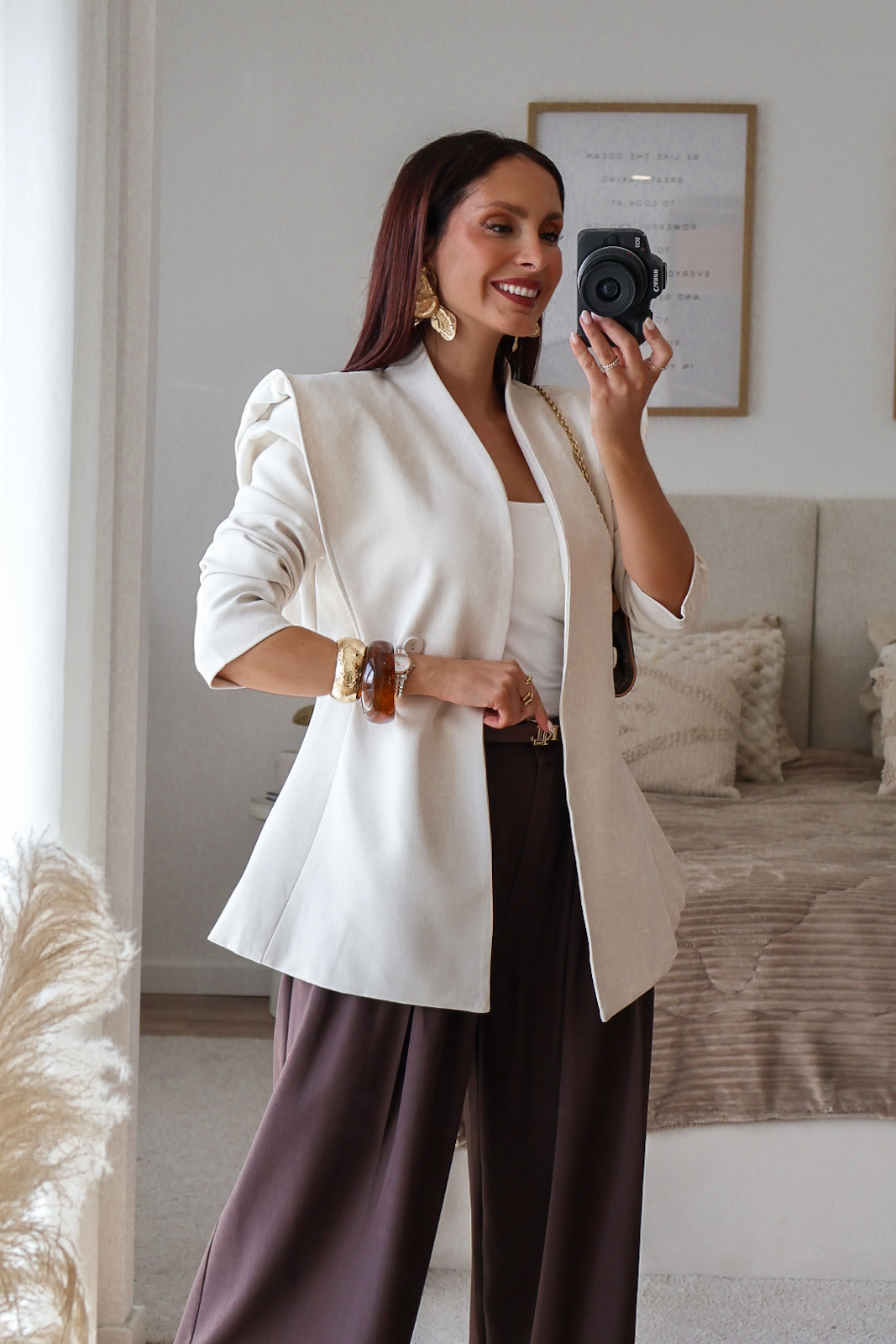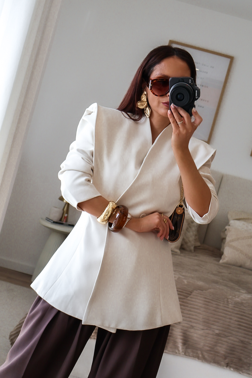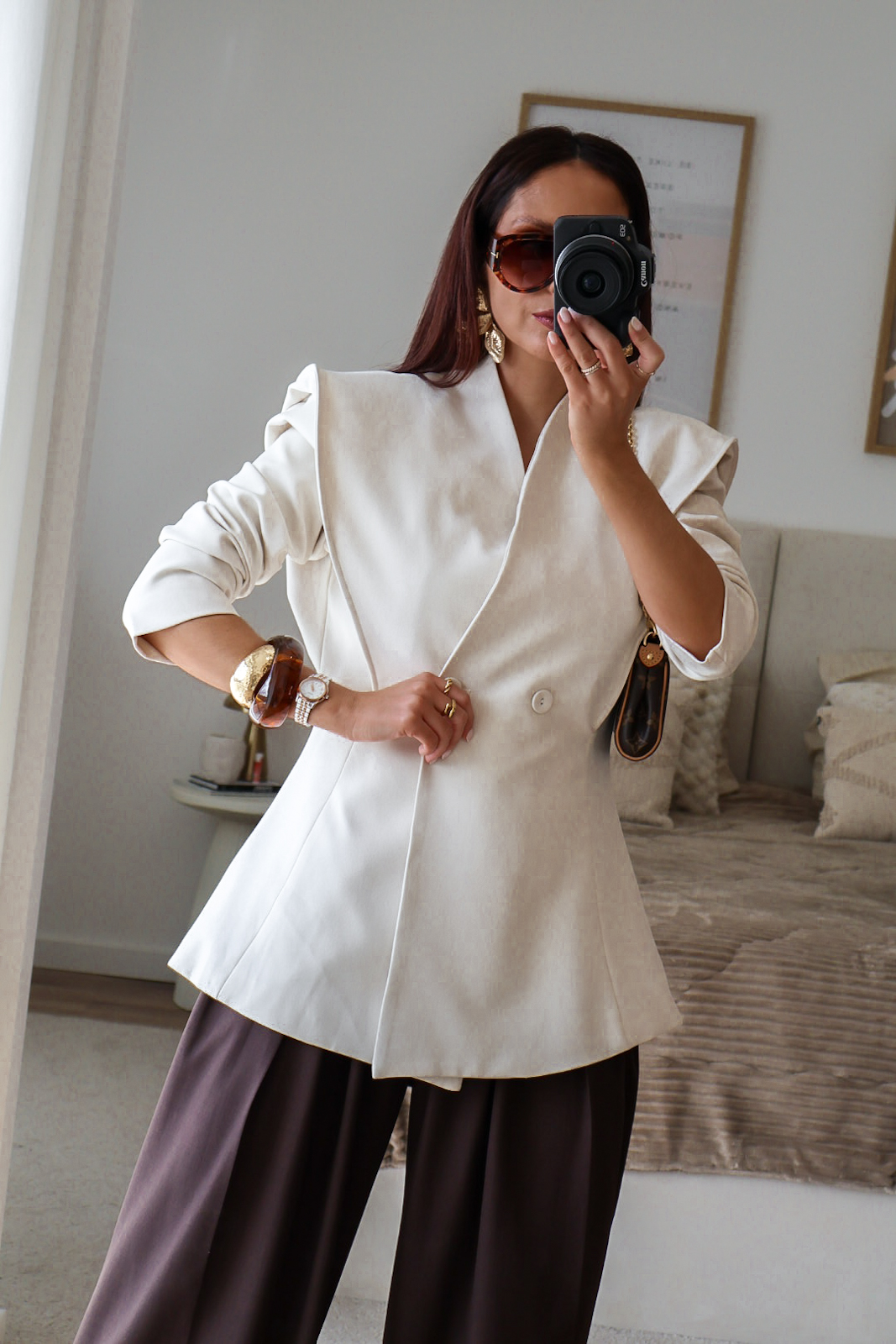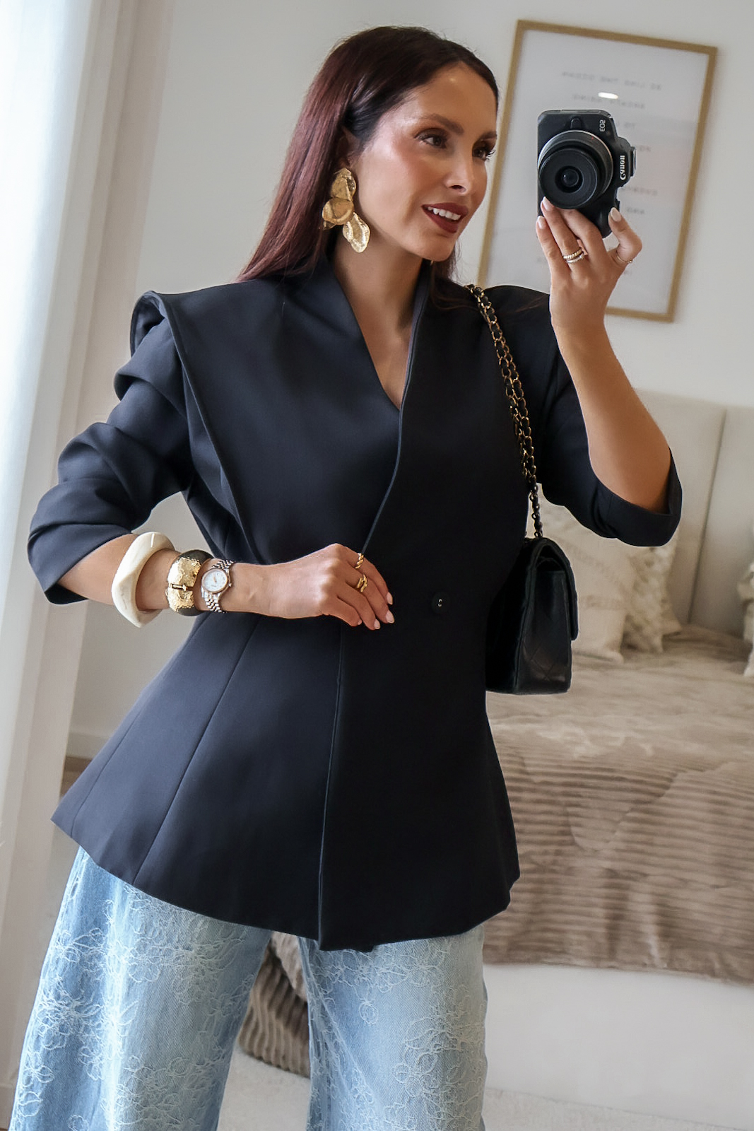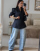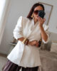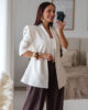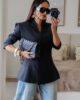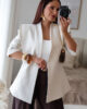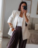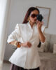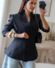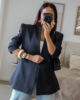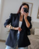 Blazer estruturado com ombreiras e botões forrados a tecido. Pode ser usado aberto ou fechado em trespasse. O design dele proporciona um visual elegante e favorece a silhueta.