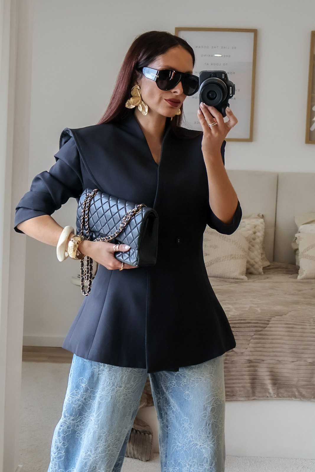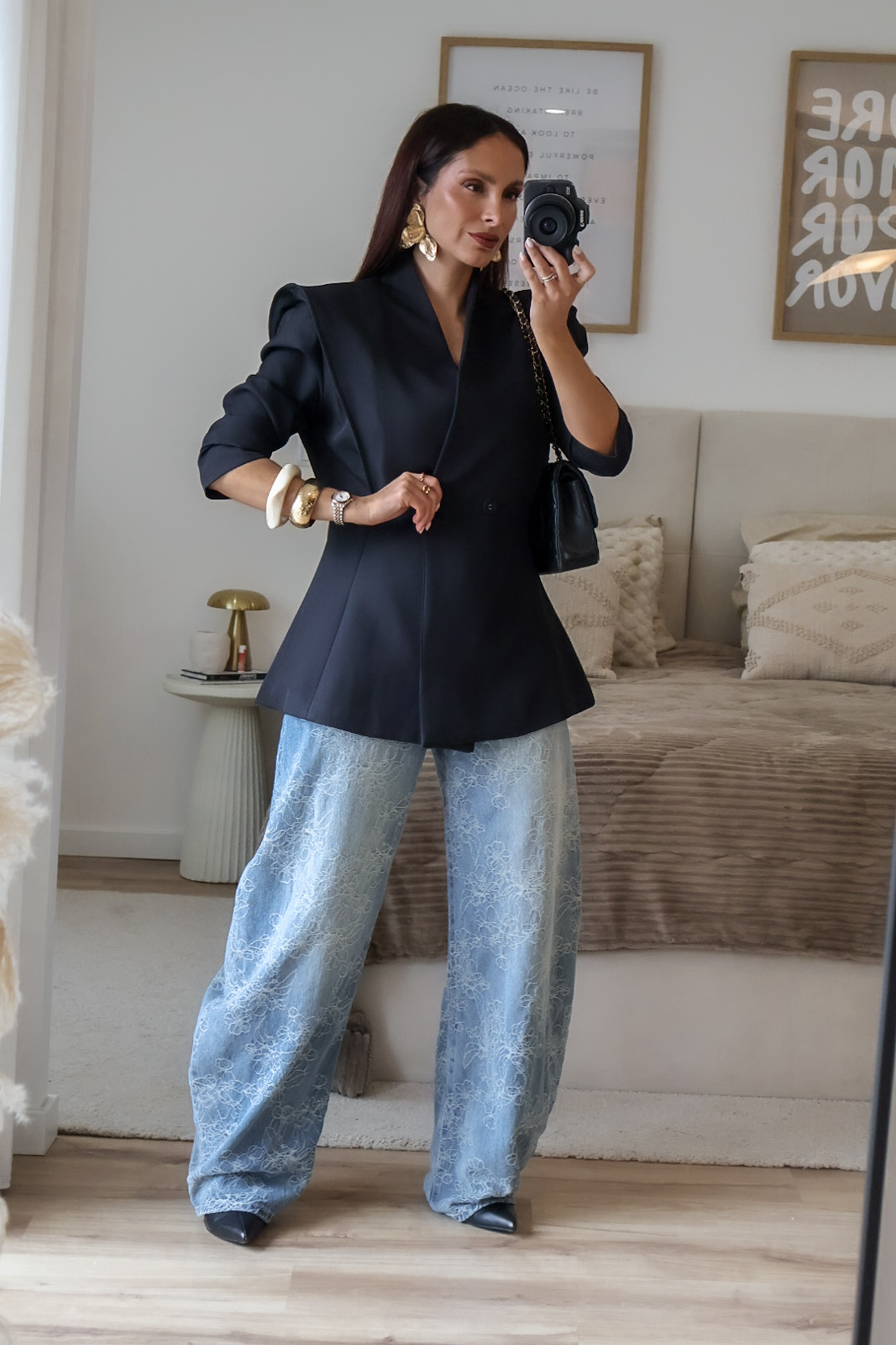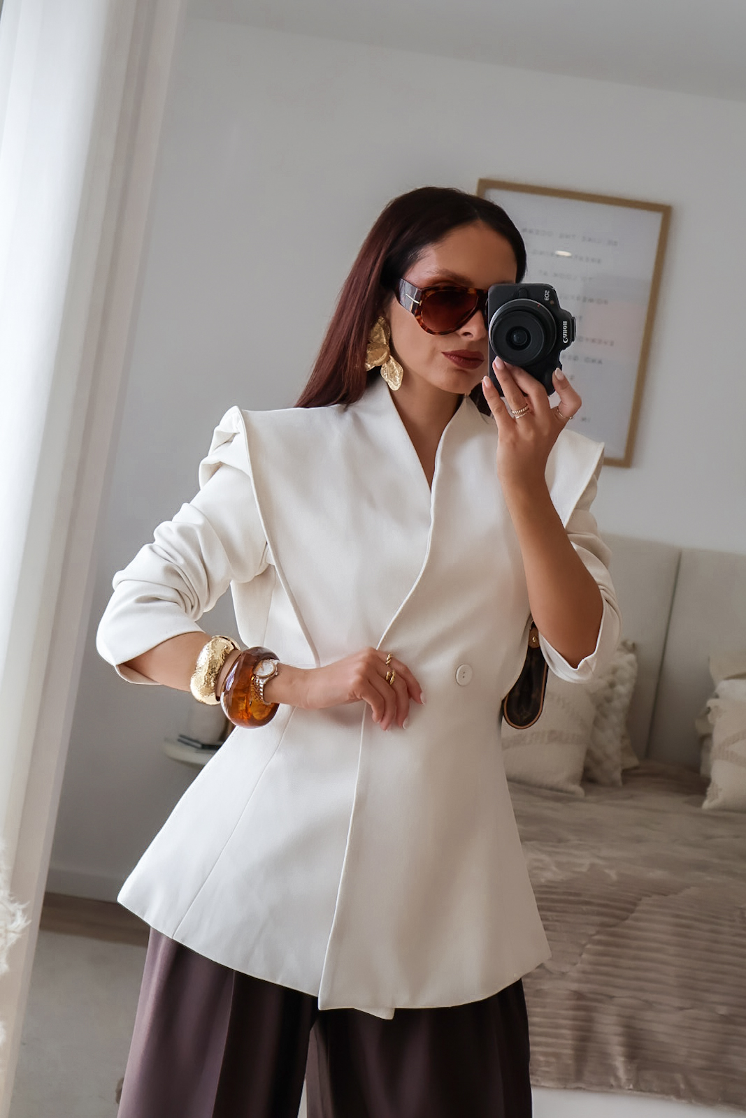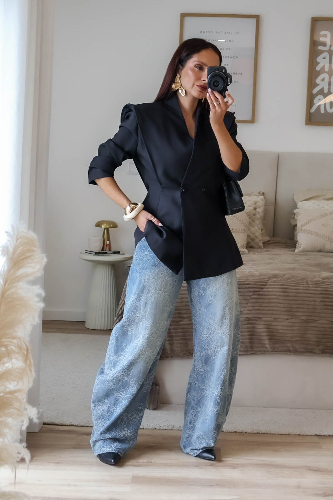 Blazer estruturado com ombreiras e botões forrados a tecido. Pode ser usado aberto ou fechado em trespasse. O design dele proporciona um visual elegante e favorece a silhueta.