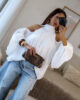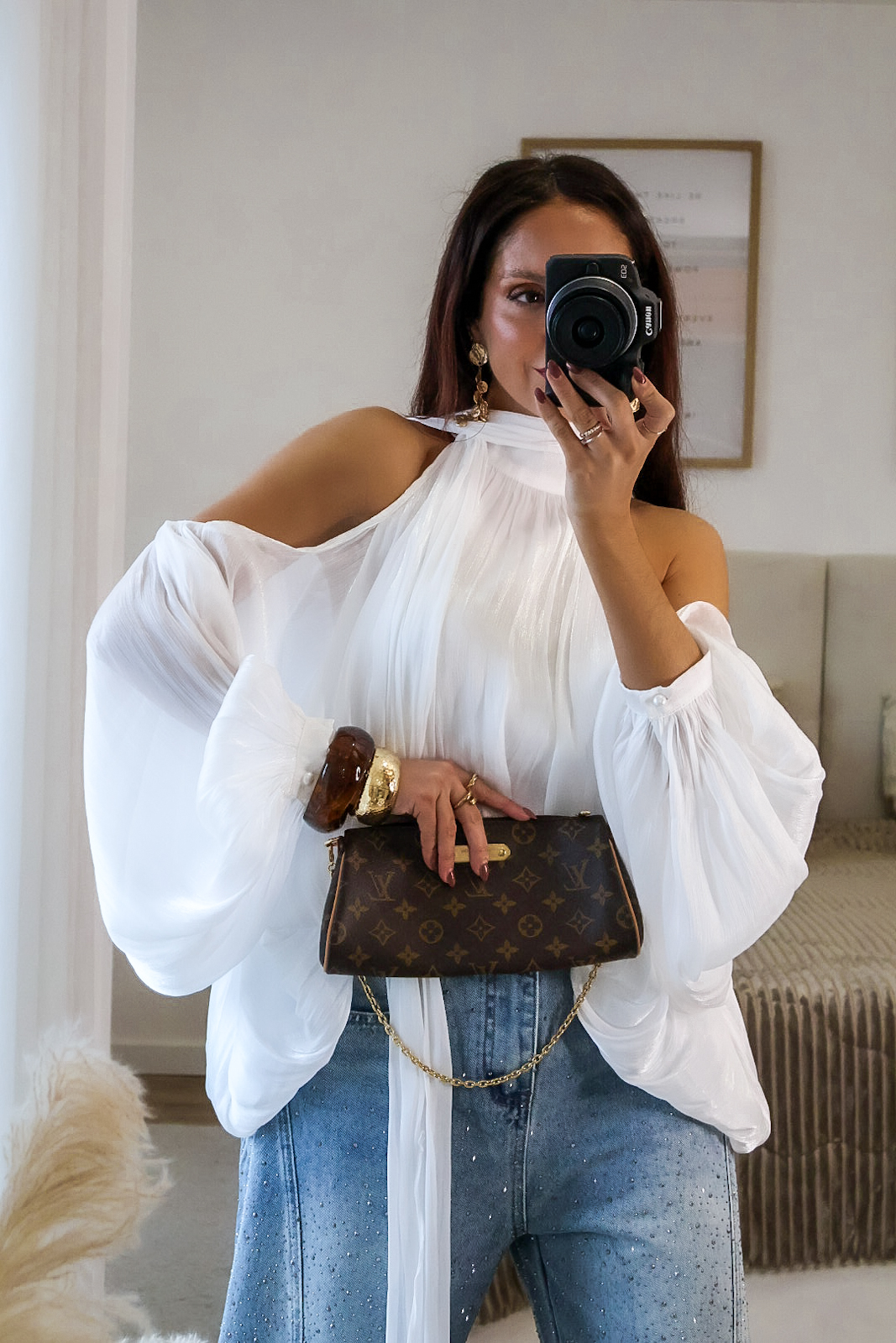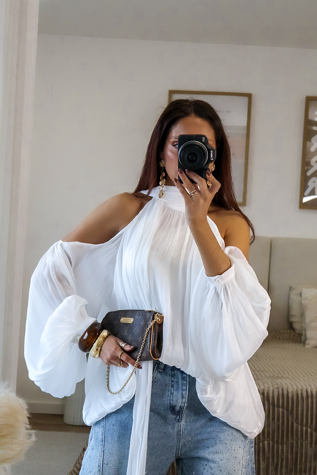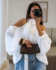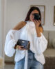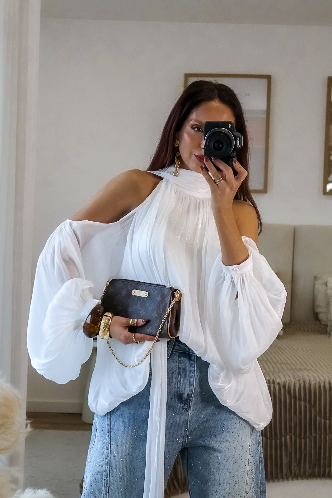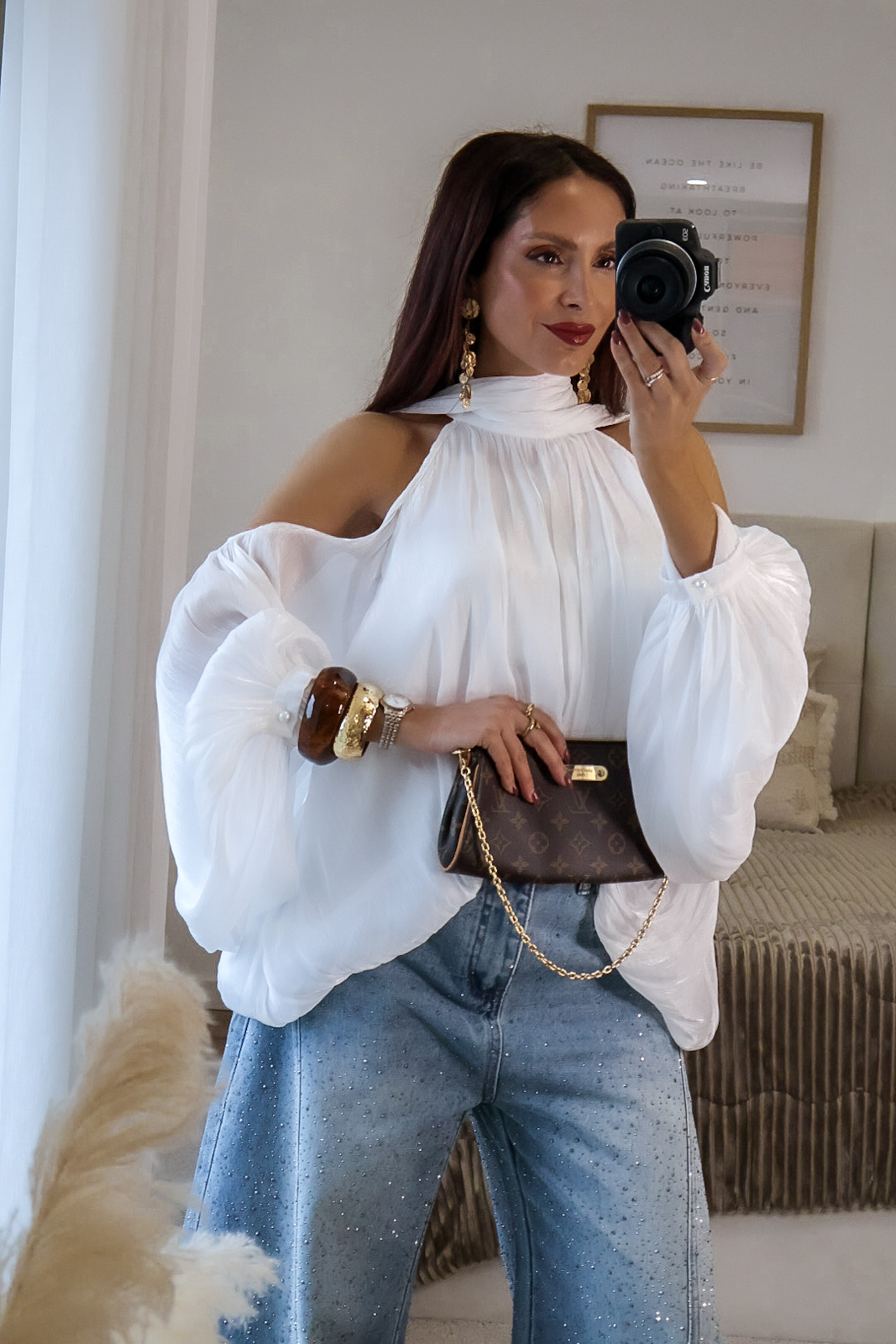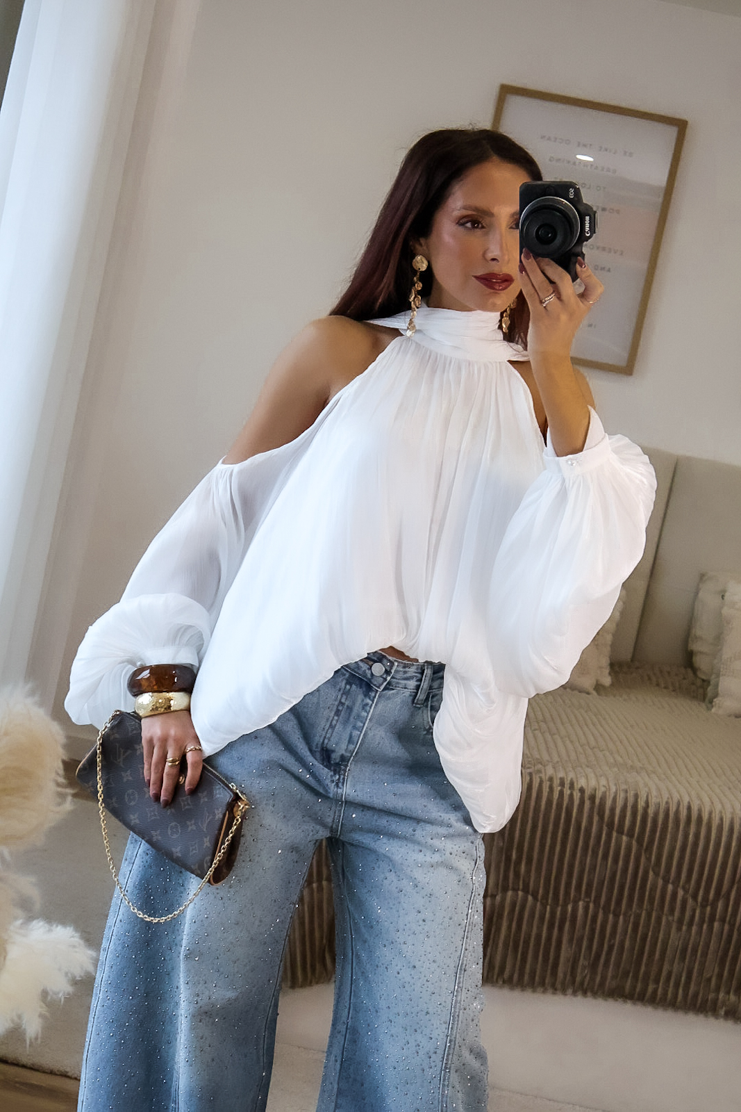 Blusa fluida com ombros descobertos. Traz lenço incluído.
