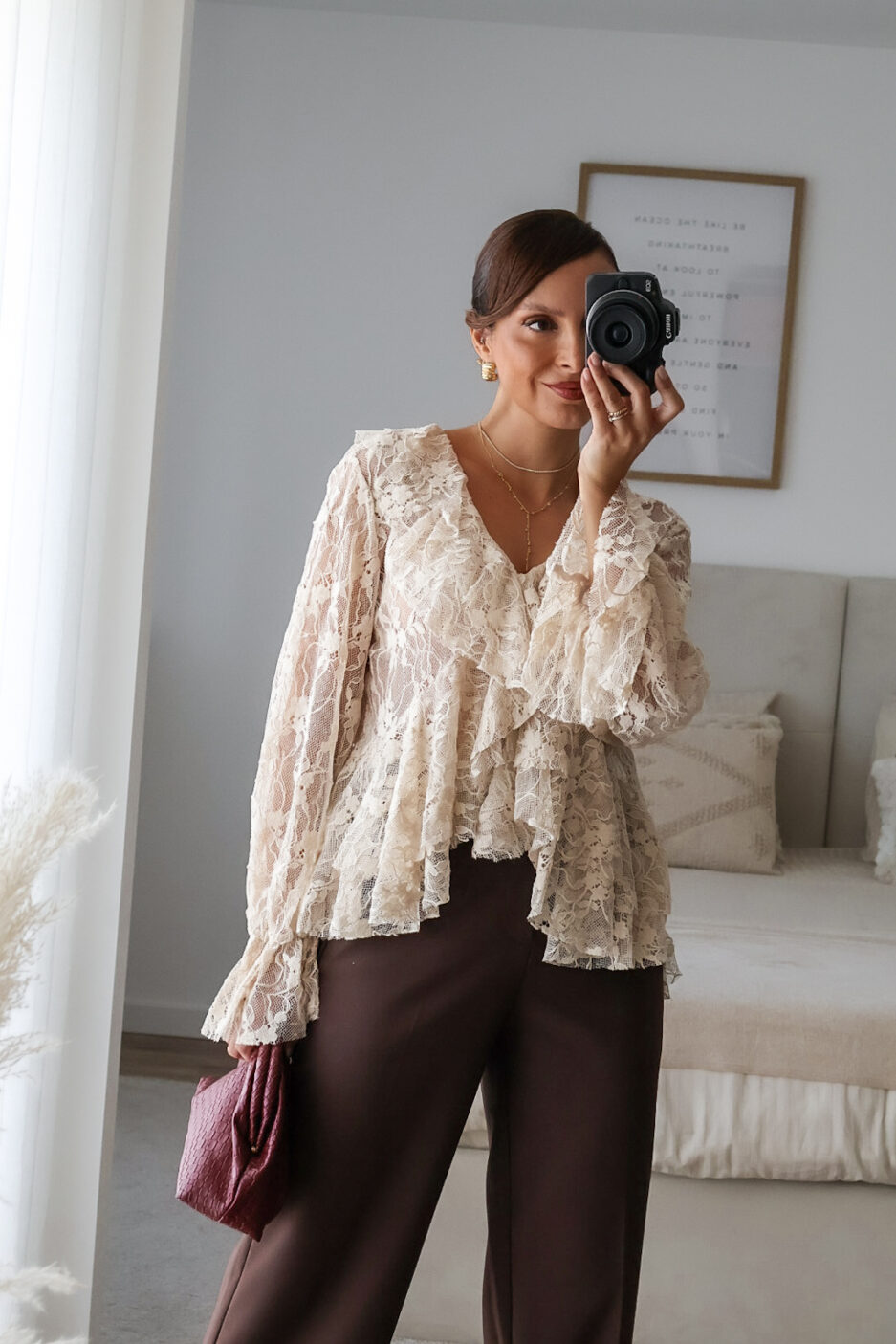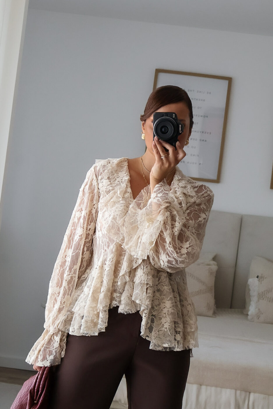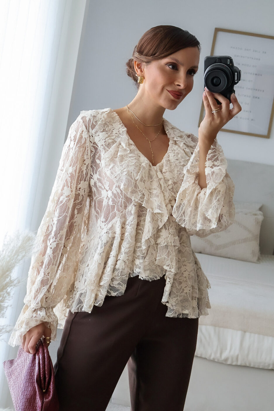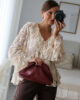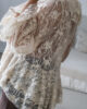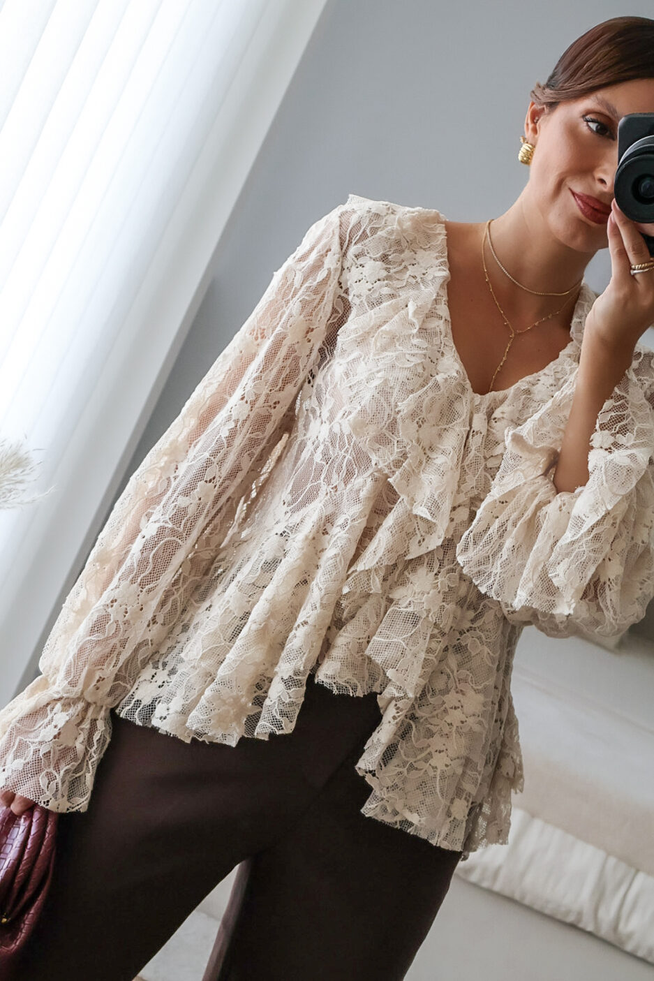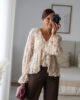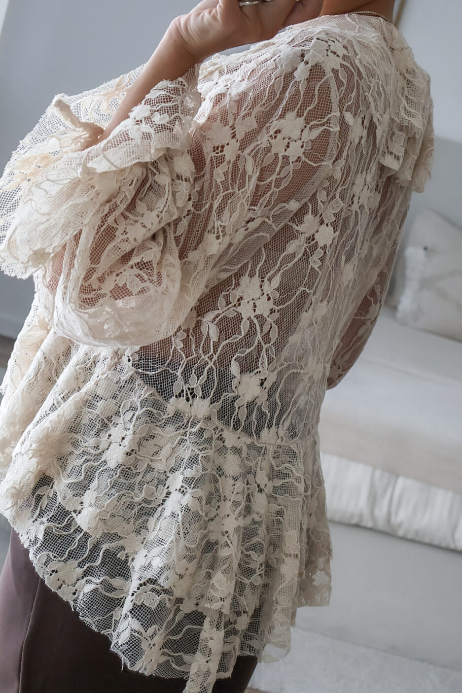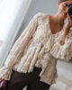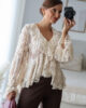 Blusa solta semitransparente confecionada em renda e detalhe de folhos. Tem elástico no punho.