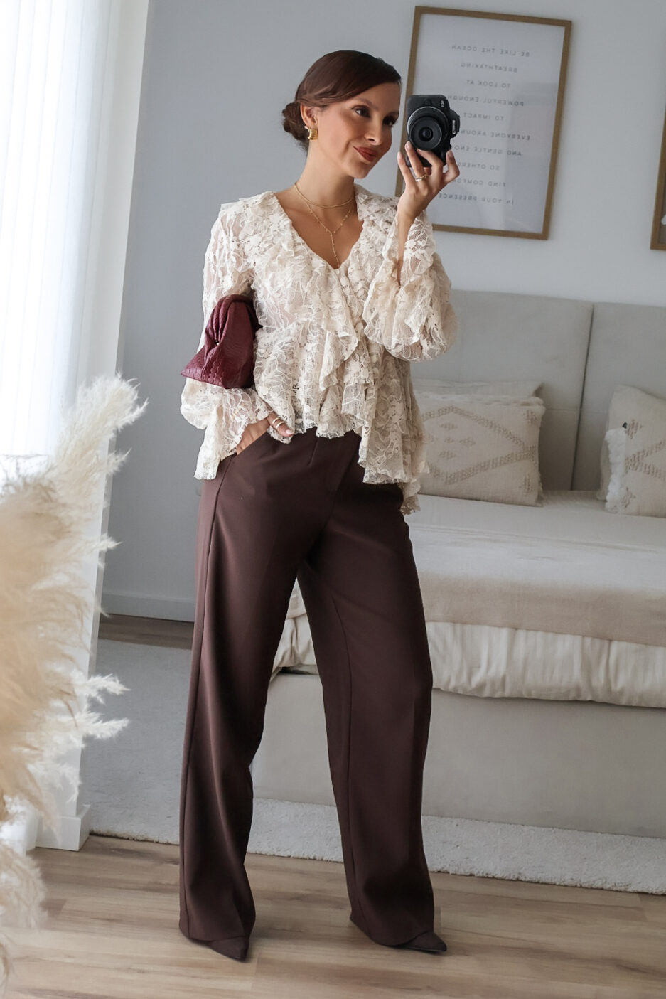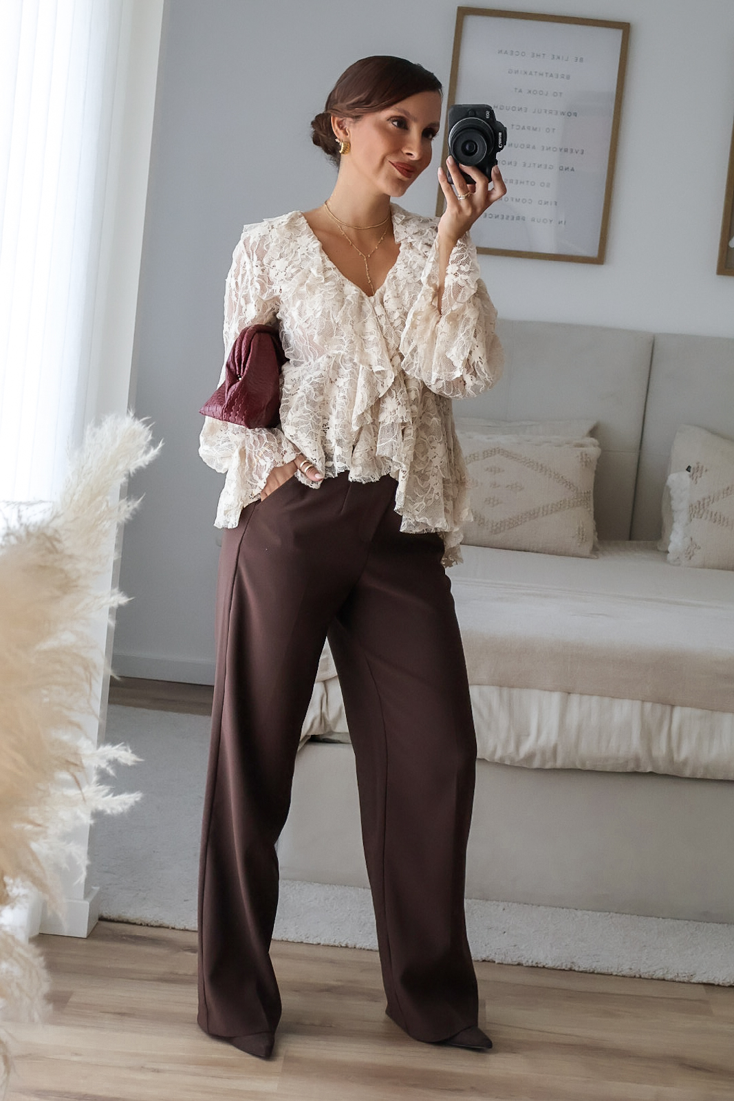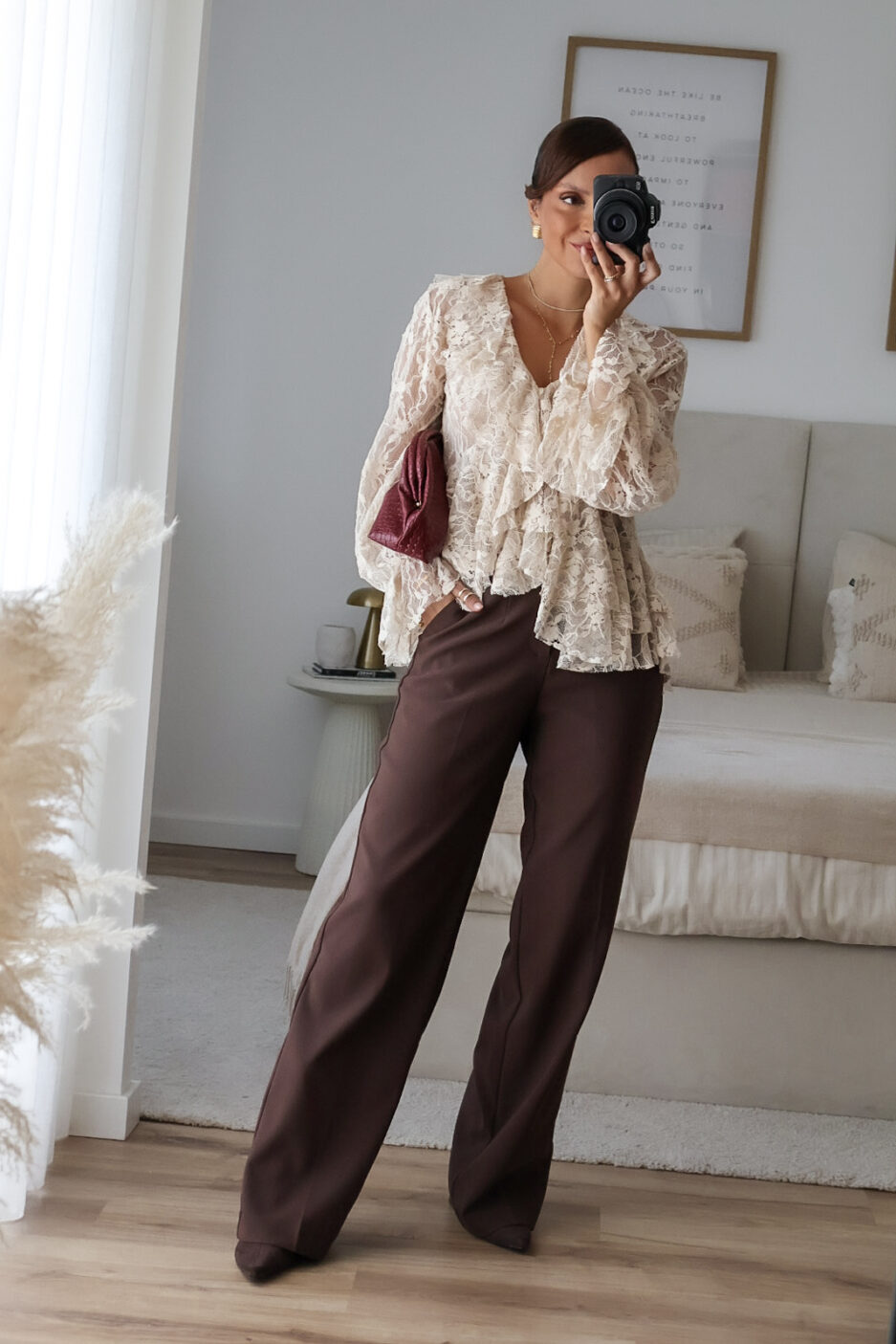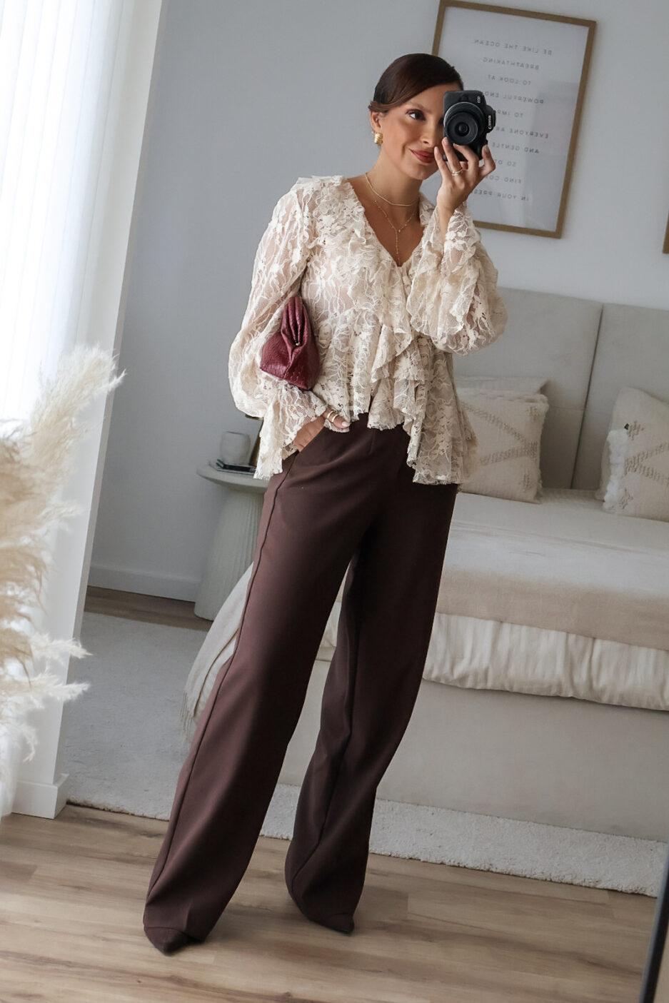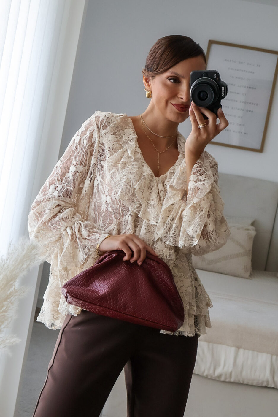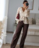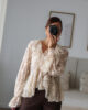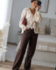 Blusa solta semitransparente confecionada em renda e detalhe de folhos. Tem elástico no punho.