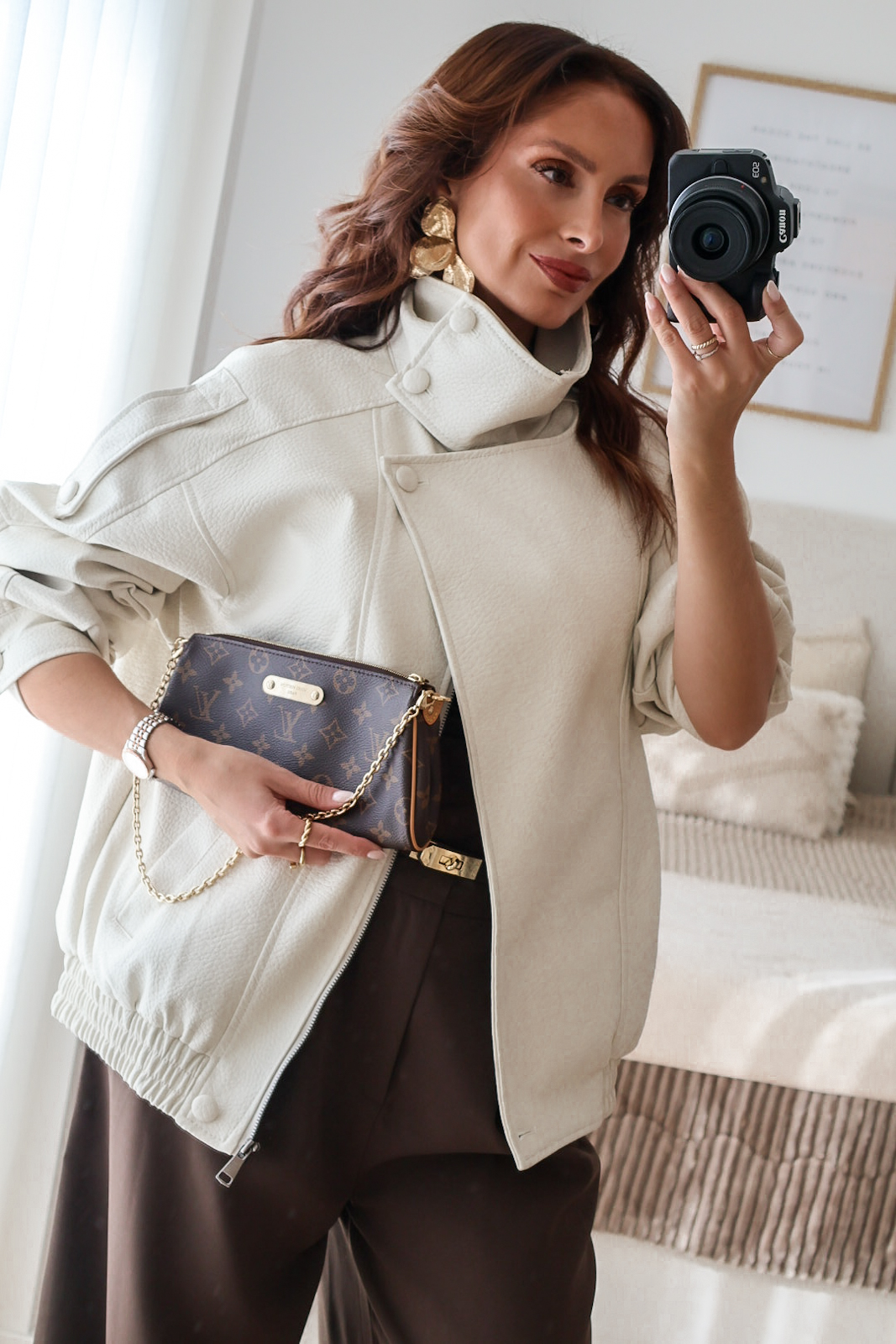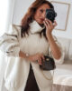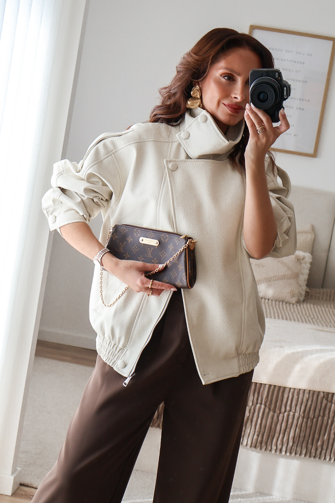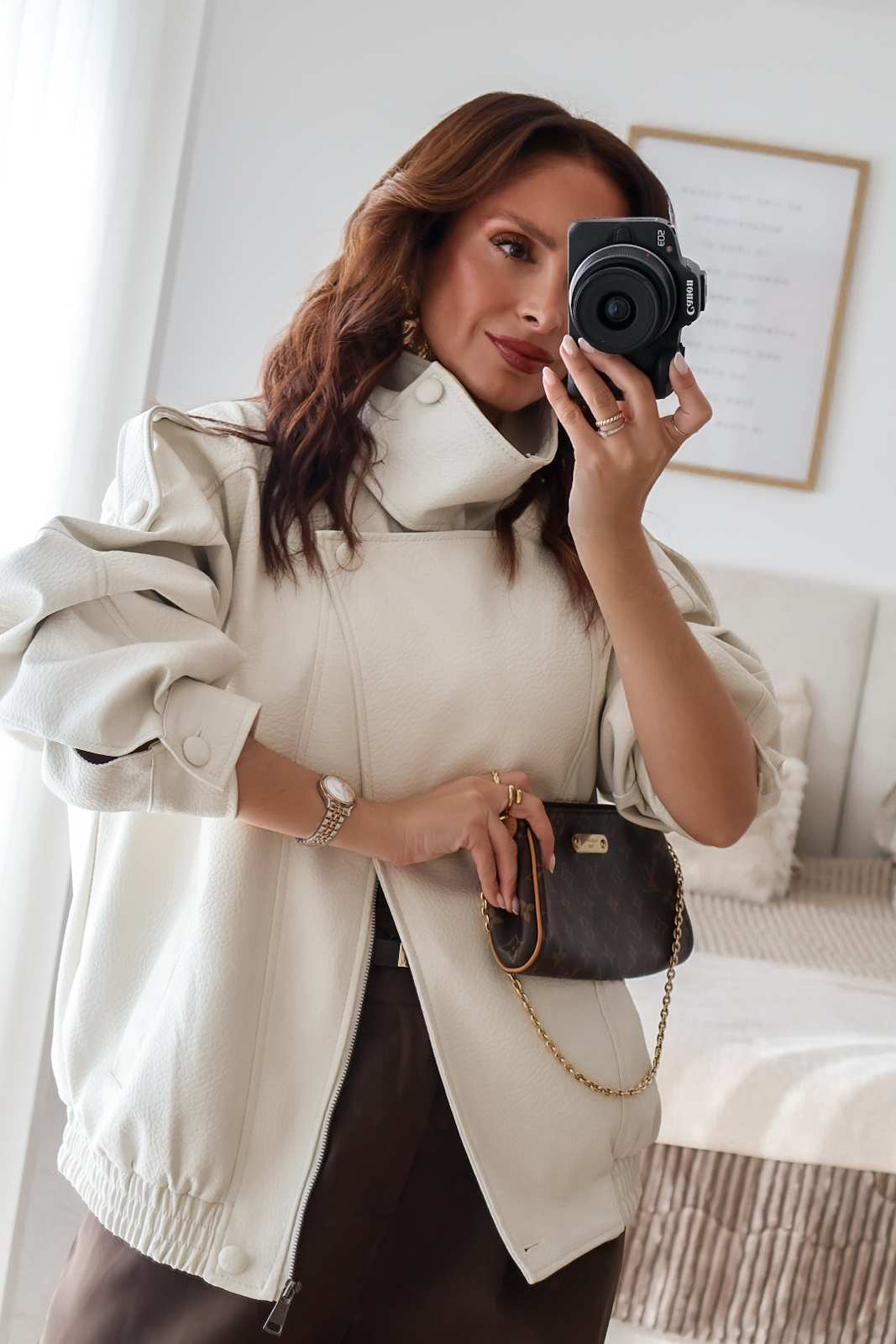Blusão em napa oversize, com corte que se tornou viral. Tem bolsos e fechos metálicos. Como sugestão, podem adicionar a estila para completar o look.