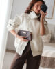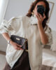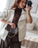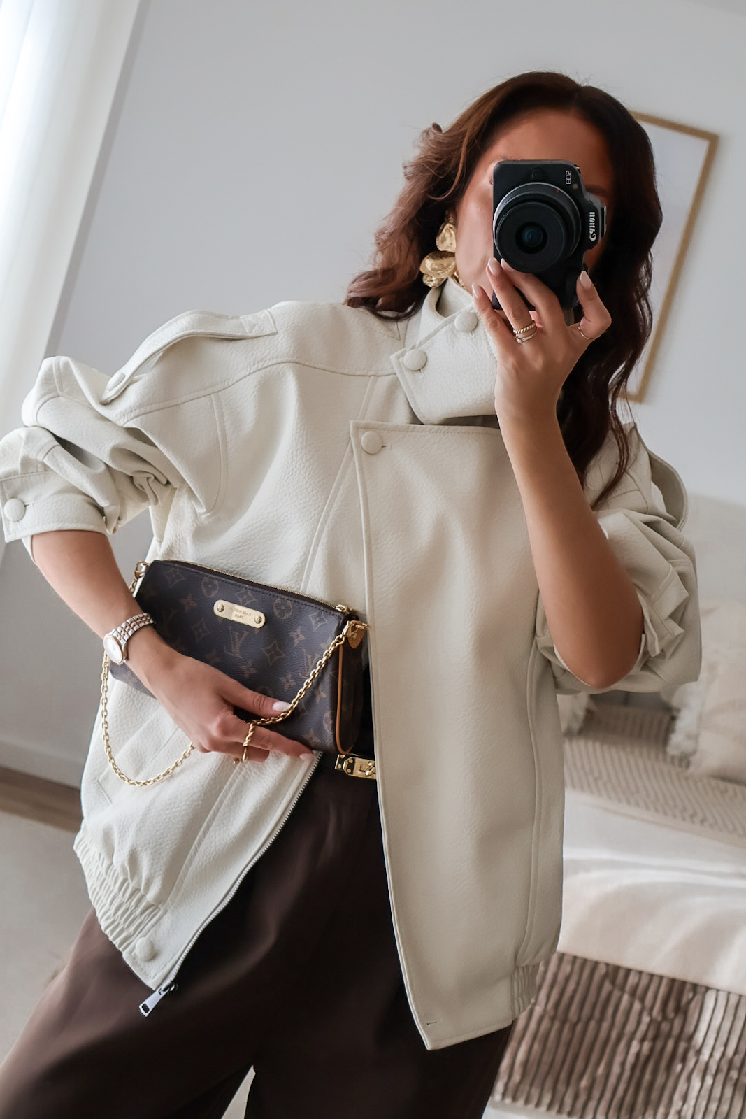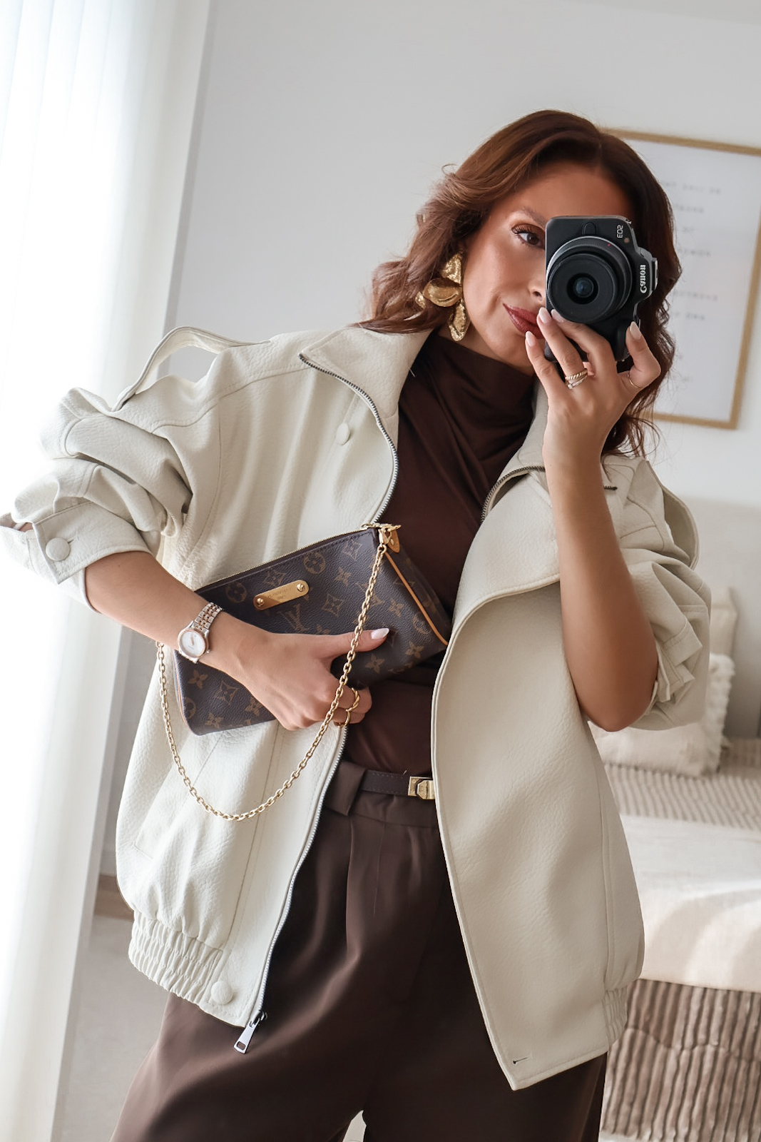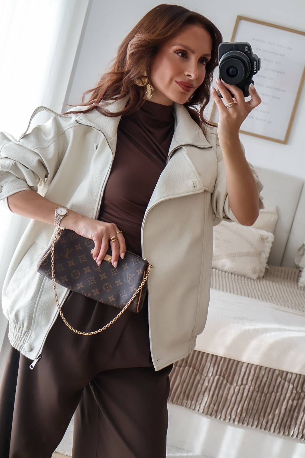 Blusão em napa oversize, com corte que se tornou viral. Tem bolsos e fechos metálicos. Como sugestão, podem adicionar a estila para completar o look.