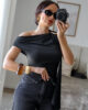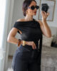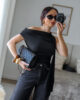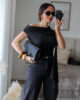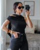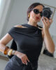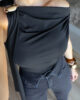 Body tecido tipo licra com detalhe efeito pedra no ombro e echarpe integrada. Tem elasticidade.