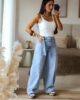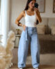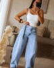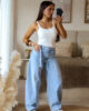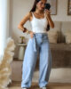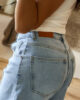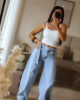 Calças de ganga modelo barrel com detalhe de sobreposição de fita no cós. Vestem super bem e a ganga é de excelente qualidade. Garantem um caimento estruturado e elegante, valorizando a silhueta. Têm elasticidade e vestem normal mas se gostarem do modelo mais solto/descido, escolham o tamanho acima. Tem bolsos e presilhas.