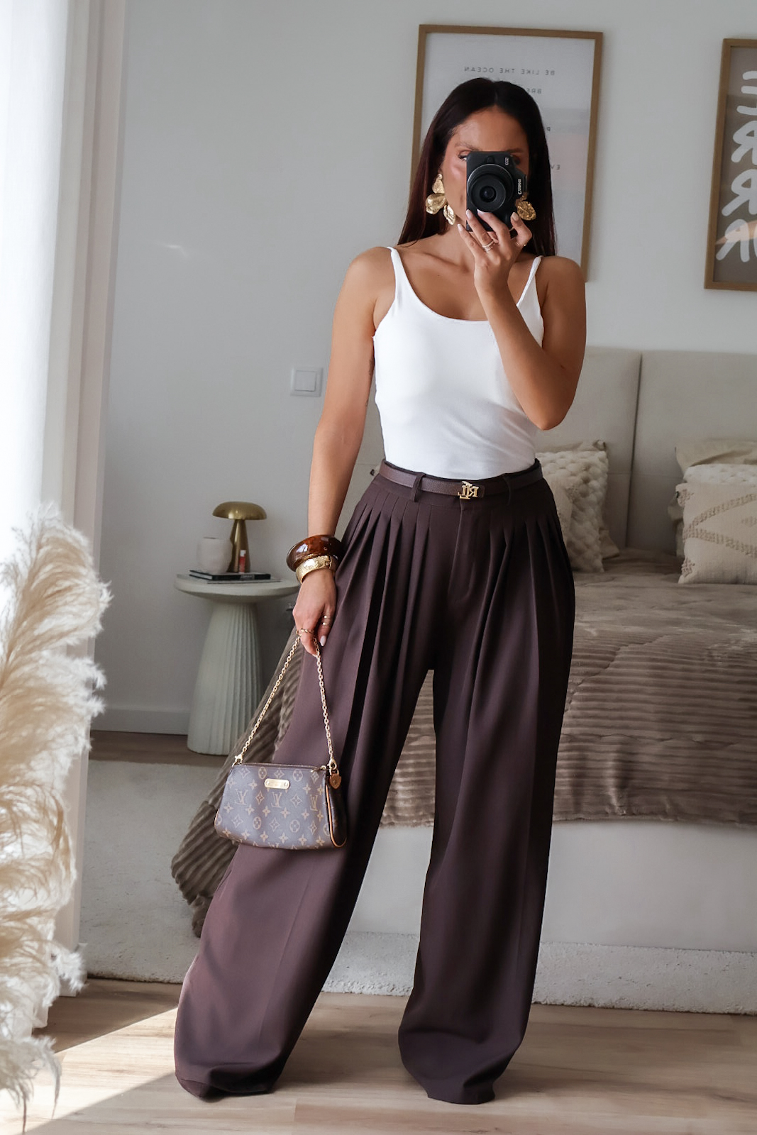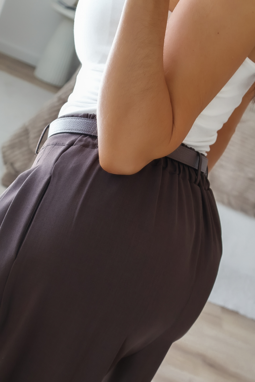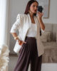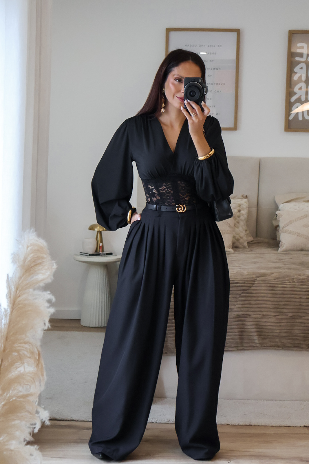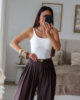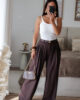 Calças de alfaiataria corte wide leg com pinças. Vestem super bem. Têm bolsos e elástico na cinta atrás.
