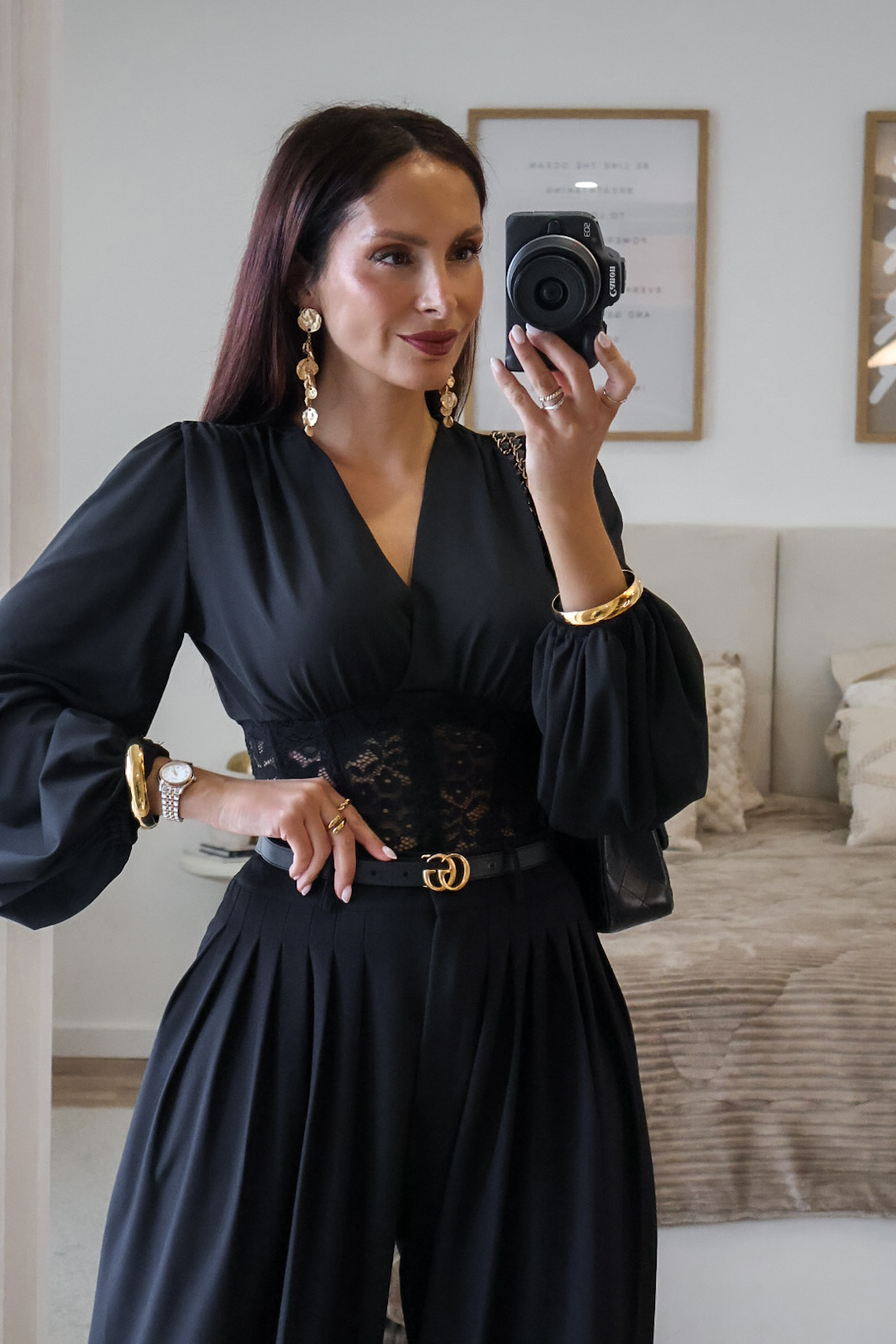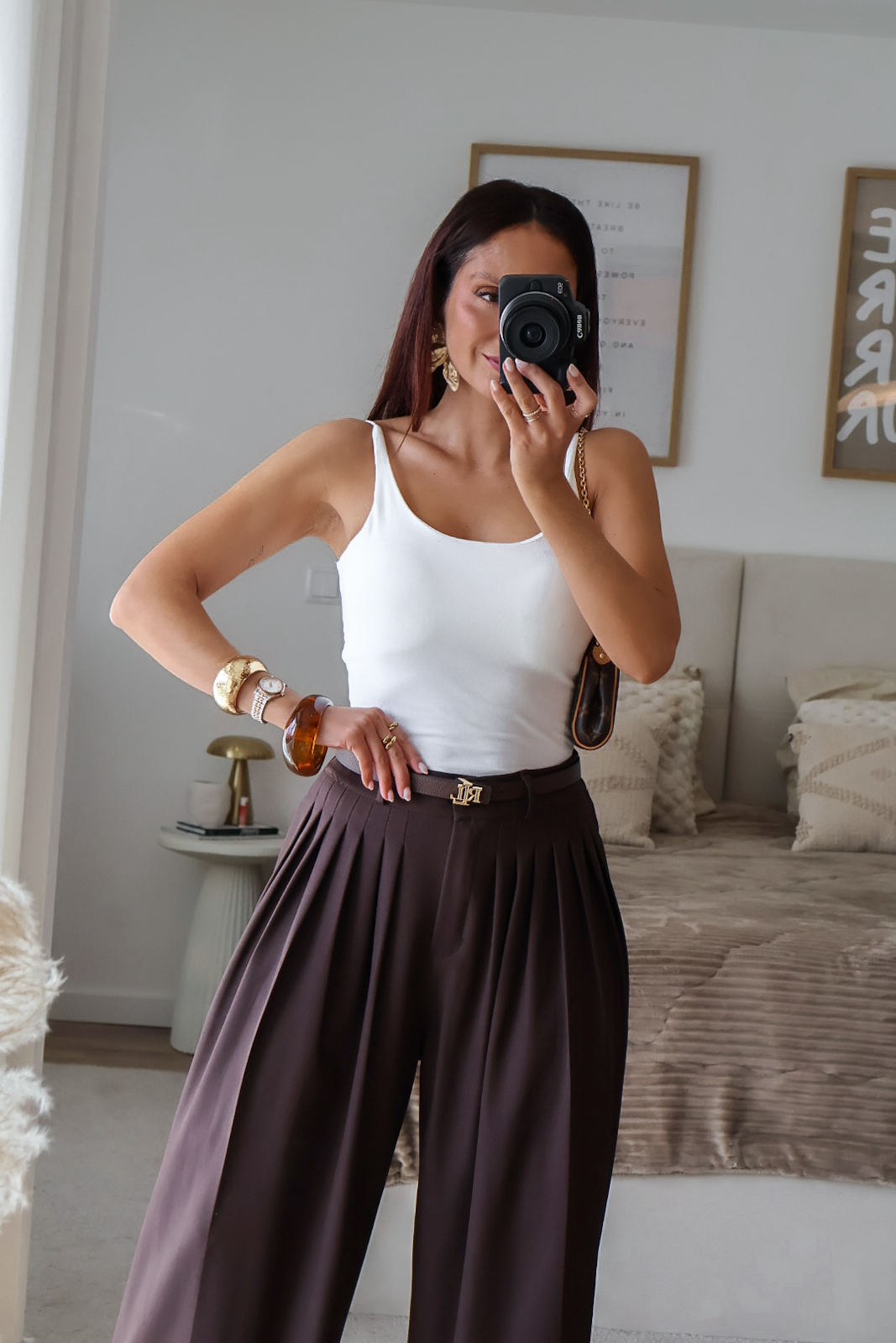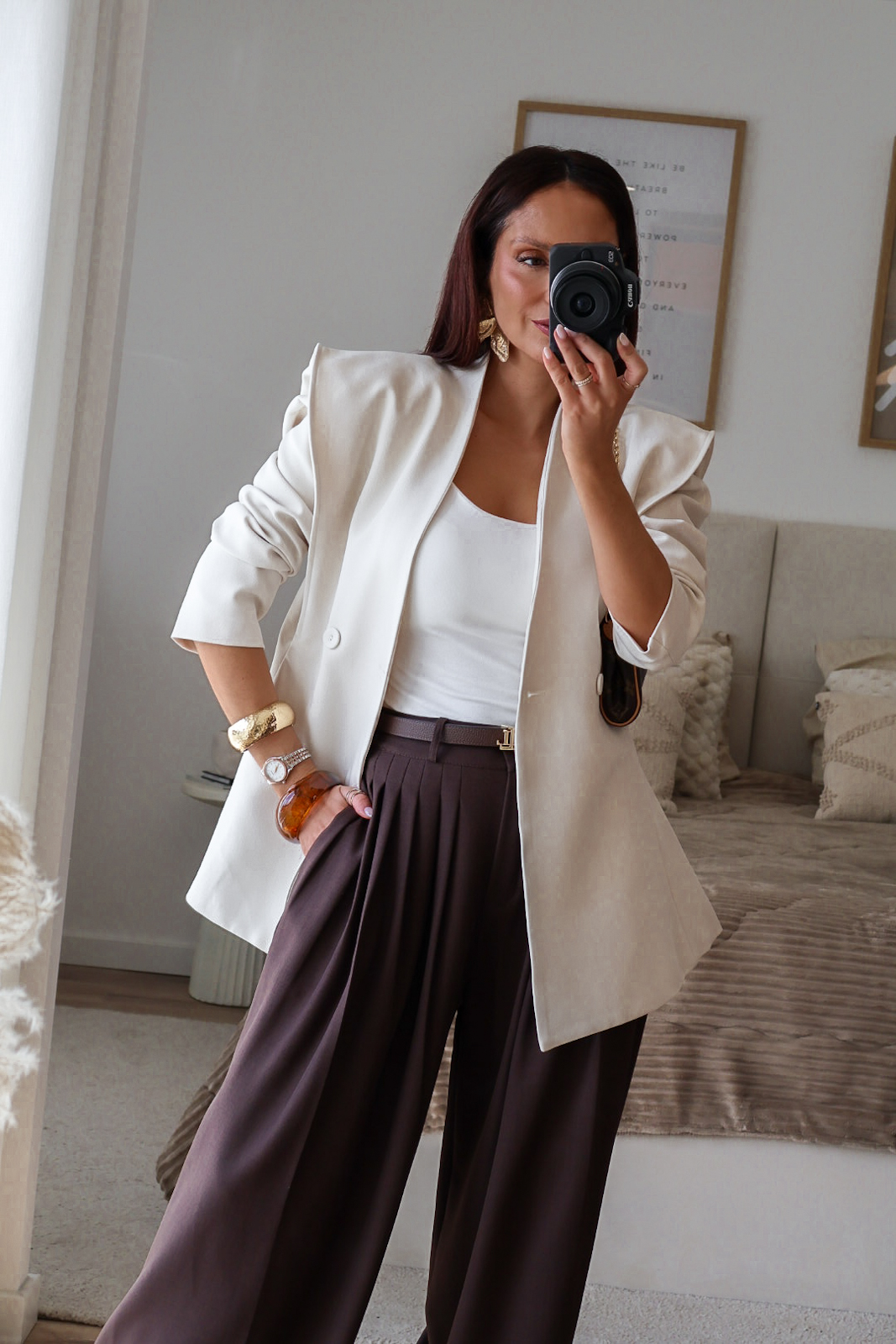 Calças de alfaiataria corte wide leg com pinças. Vestem super bem. Têm bolsos e elástico na cinta atrás.