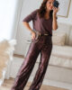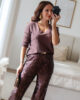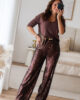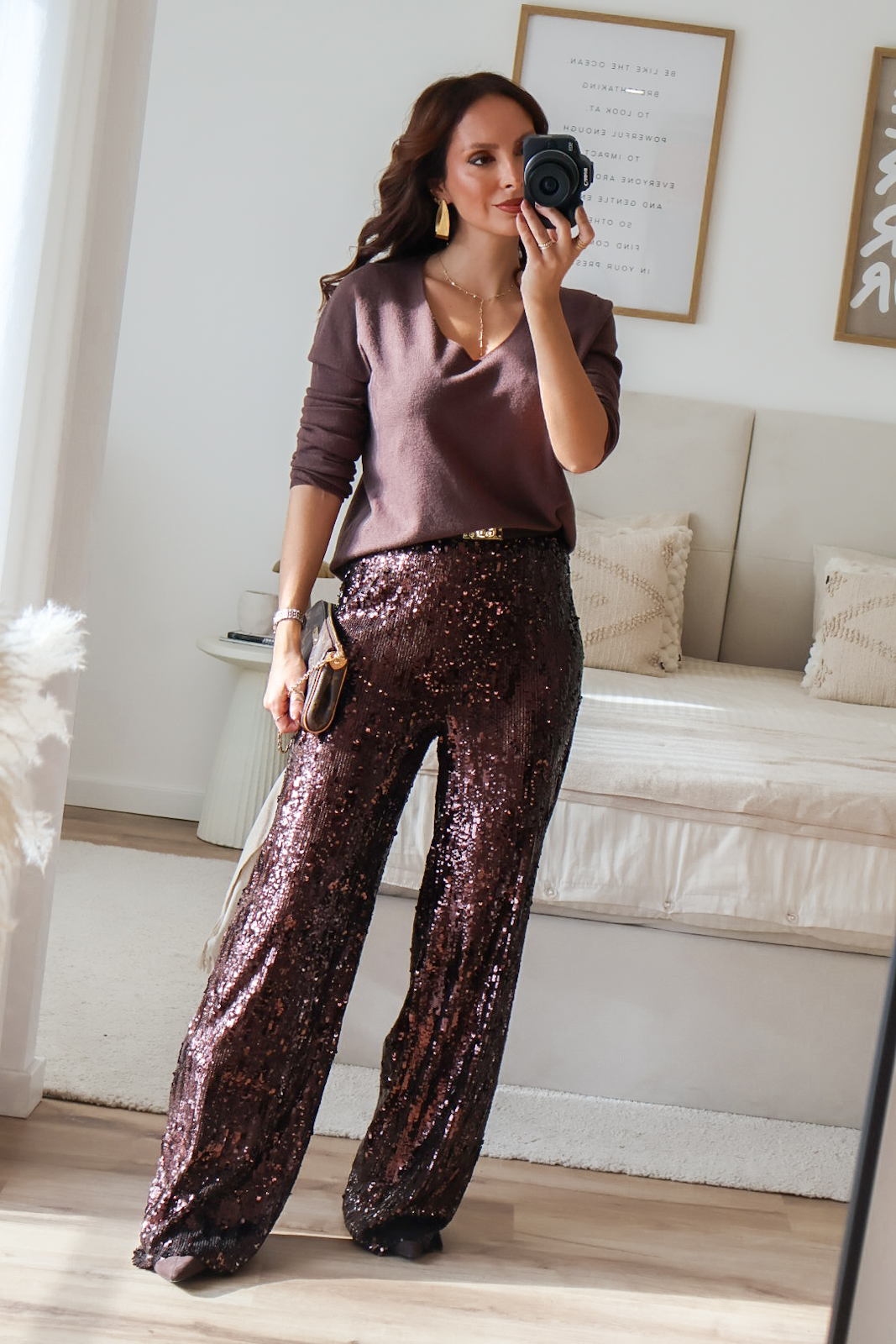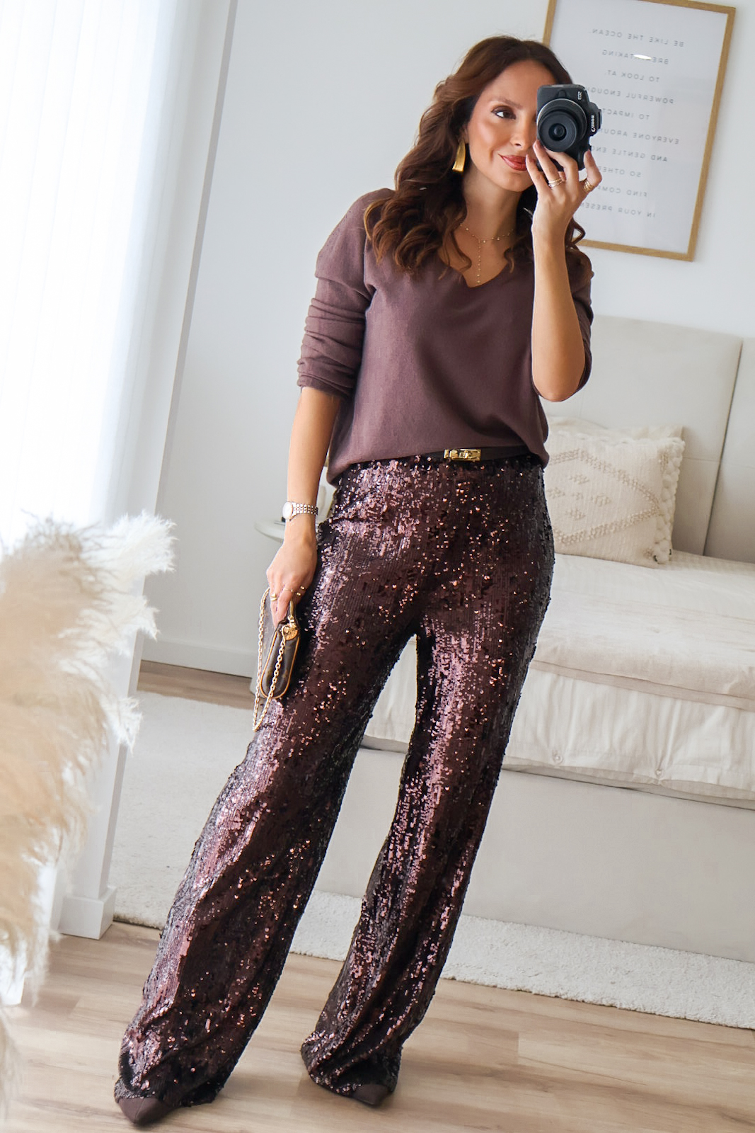 Calças de lantejoulas forradas no interior. São de cinta subida e tê elas uma cinta. Vestem super bem. O tecido tem ótima qualidade.