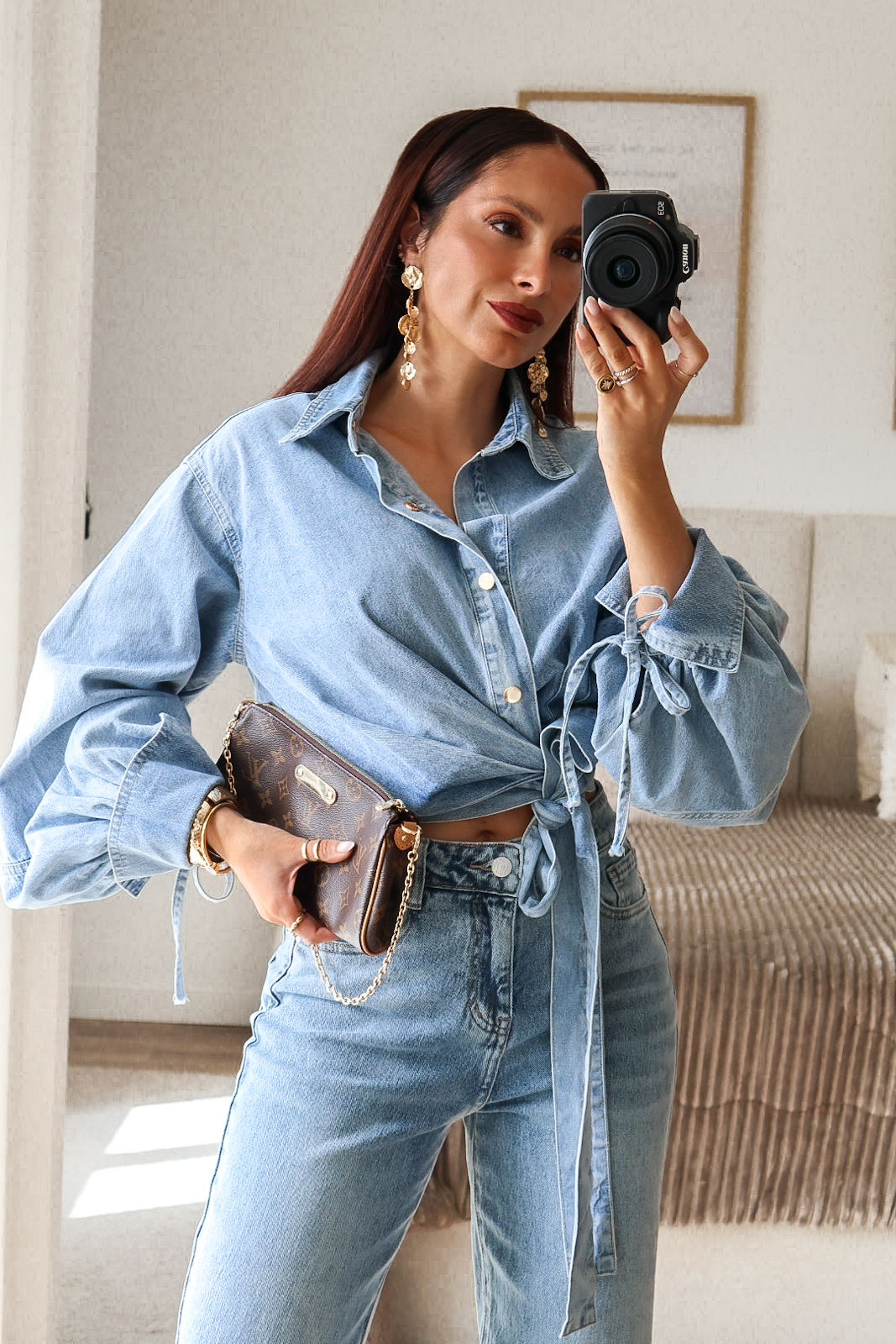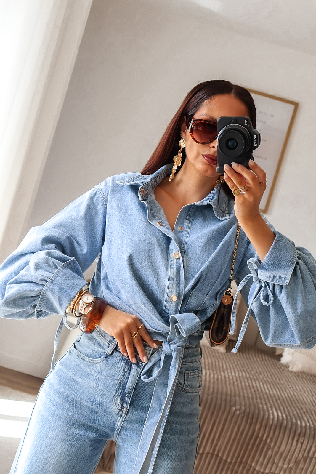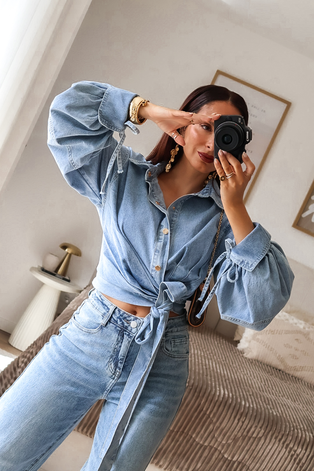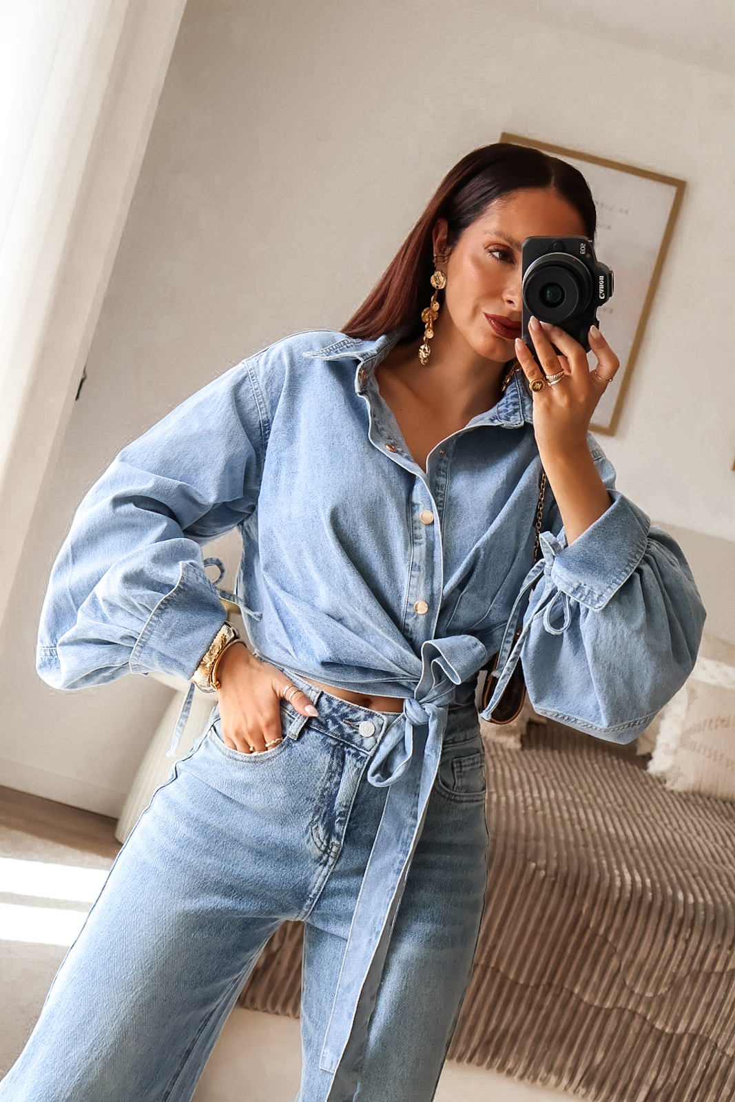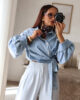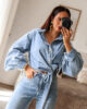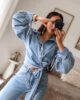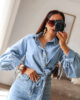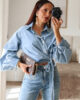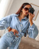 Camisa assimétrica de ganga. Aperta com molas e de lado com duas tiras/laço. Mangas efeito abalonado. Ganga de ótima qualidade.