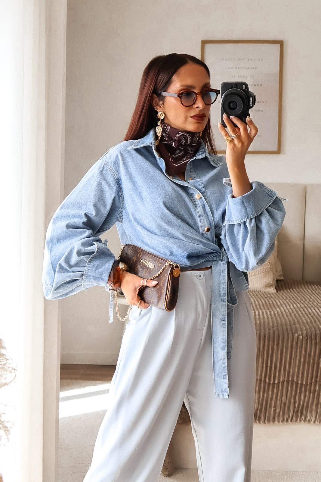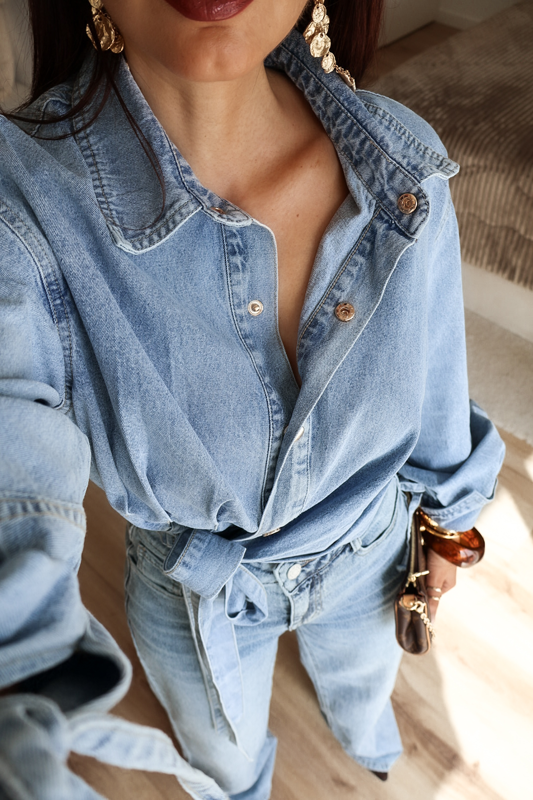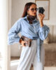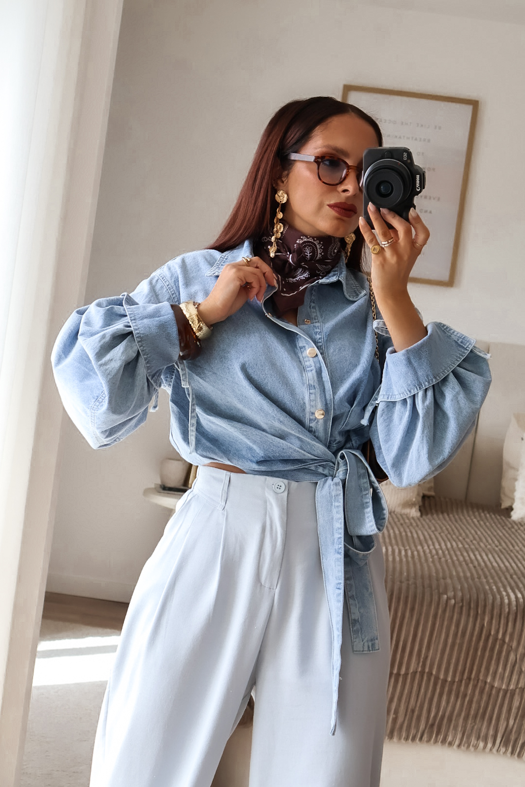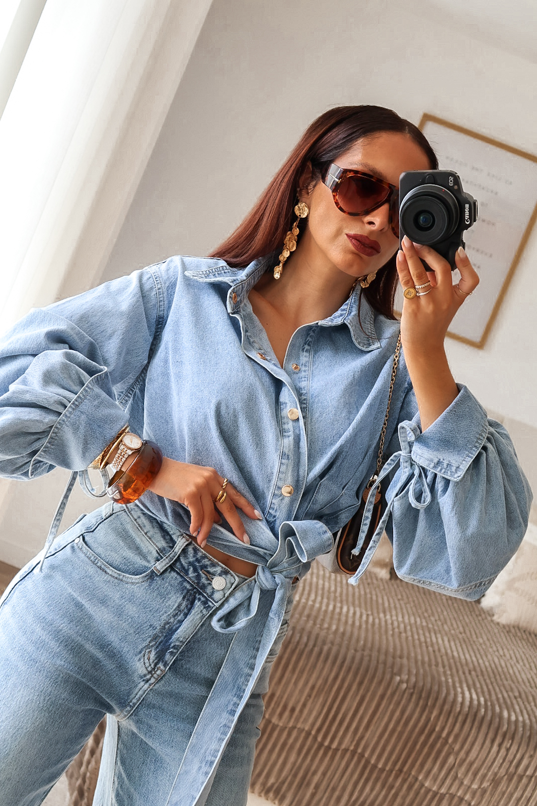 Camisa assimétrica de ganga. Aperta com molas e de lado com duas tiras/laço. Mangas efeito abalonado. Ganga de ótima qualidade.
