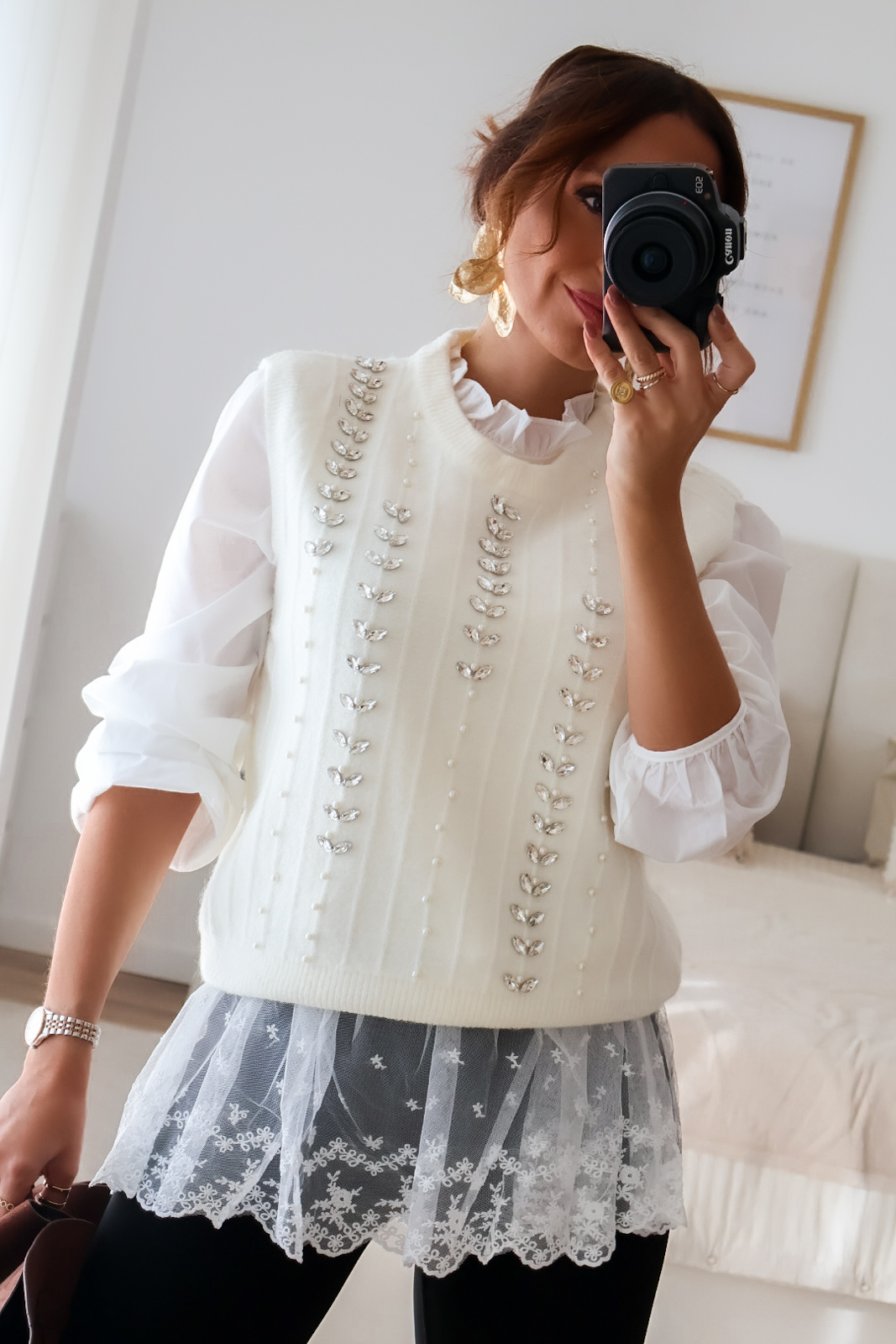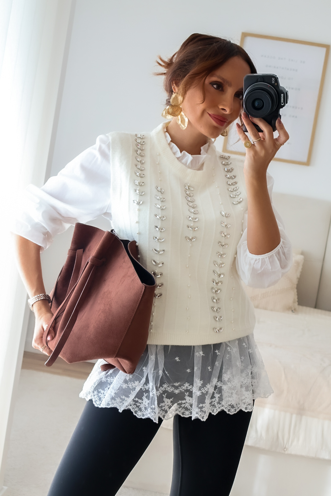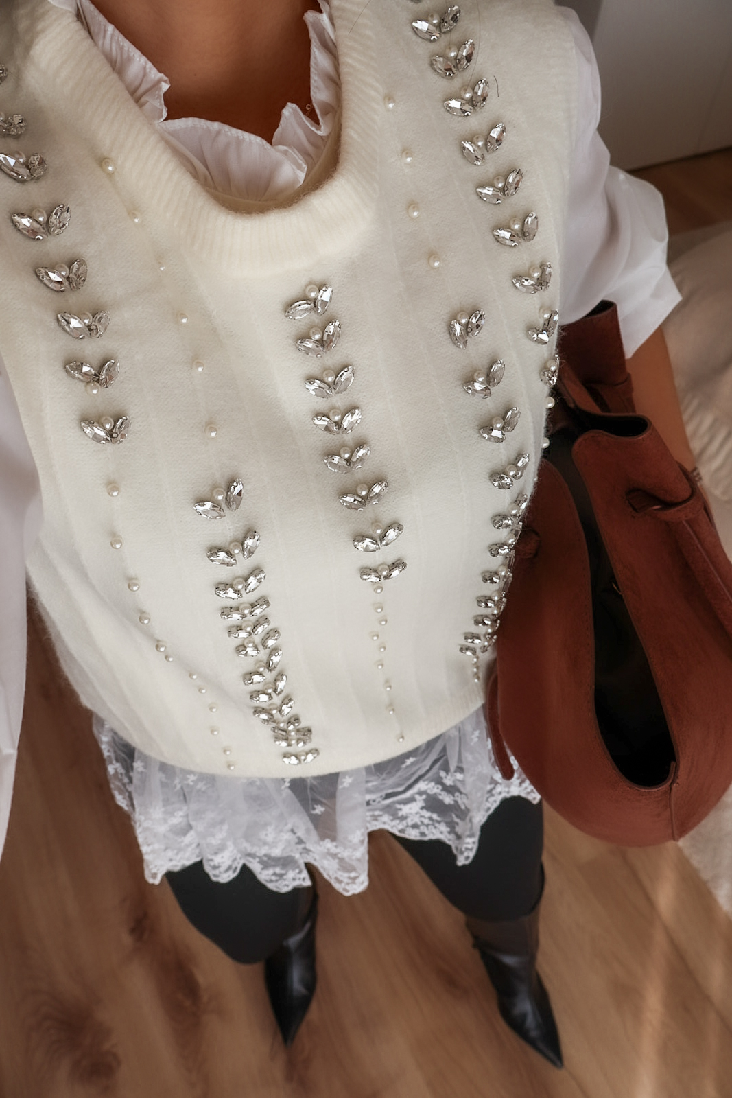 Camisa com aplicação de renda em baixo. Colete de malha com elasticidade e aplicações.
