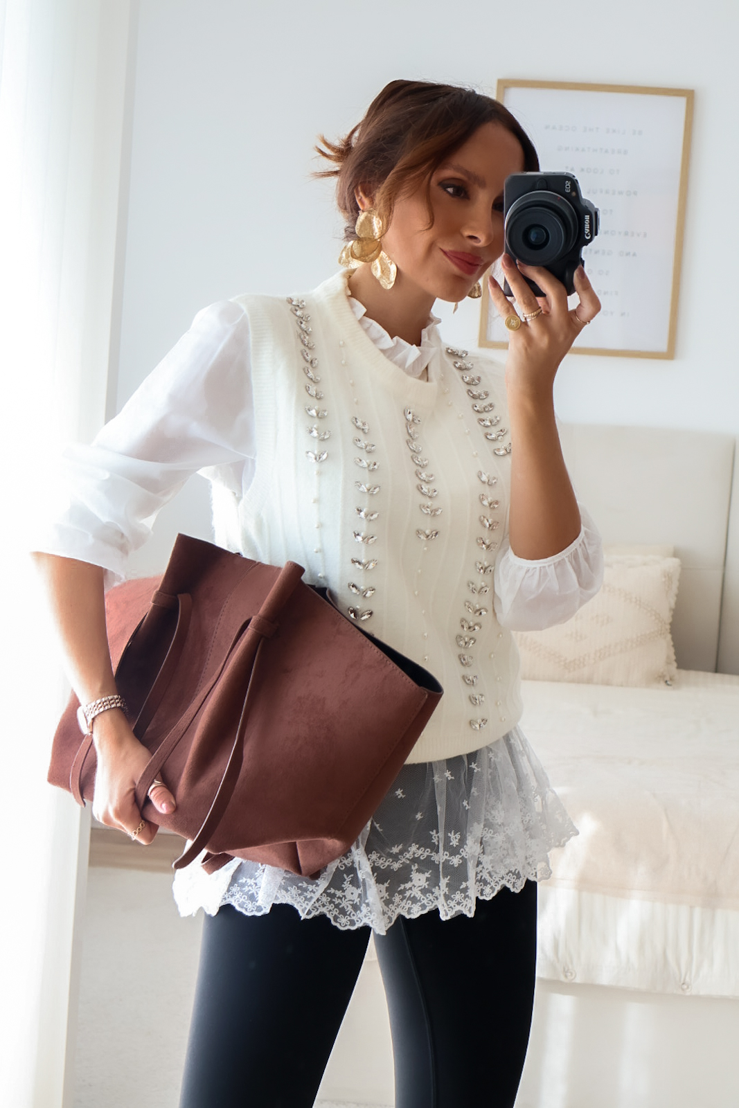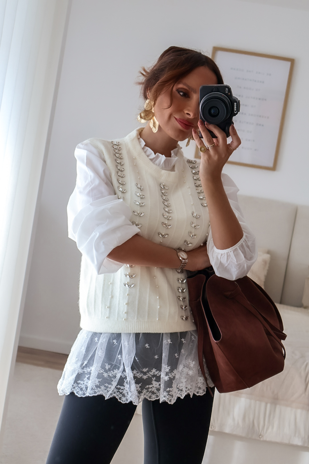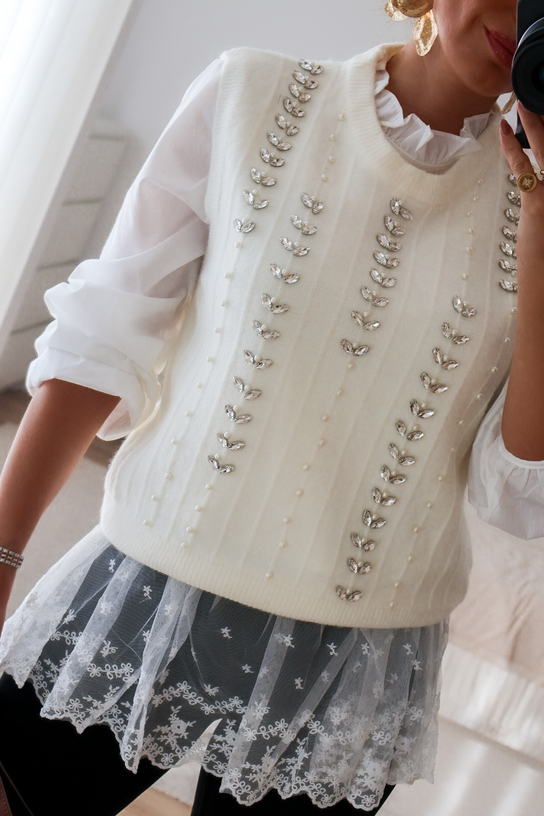 Camisa com aplicação de renda em baixo. Colete de malha com elasticidade e aplicações.