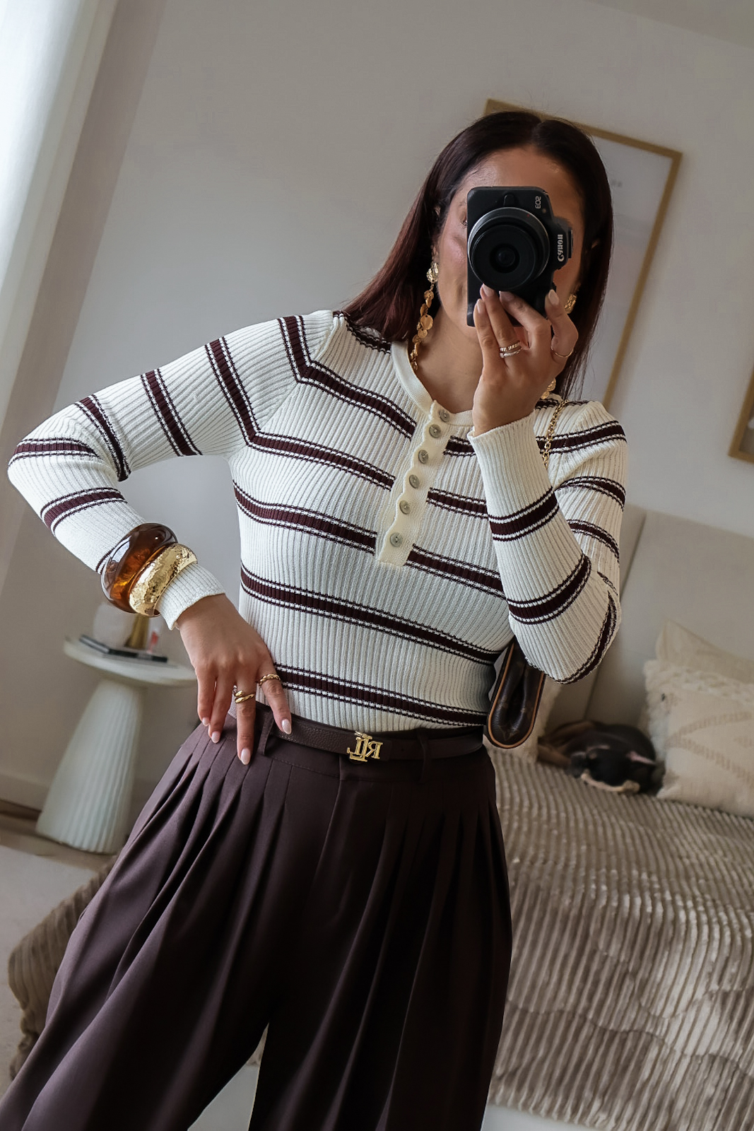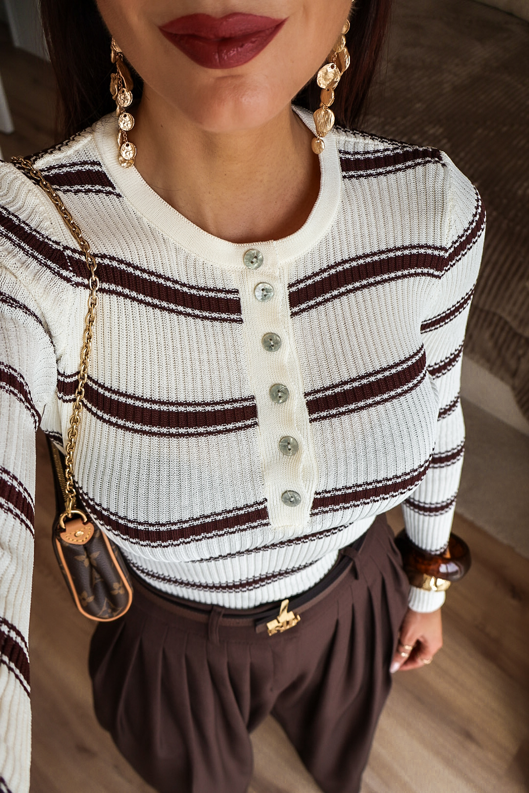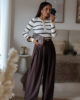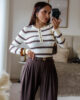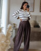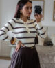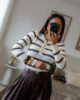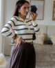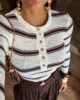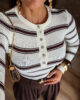 Camisola de malha com riscas. Tem bastante elasticidade e detalhe de botões.