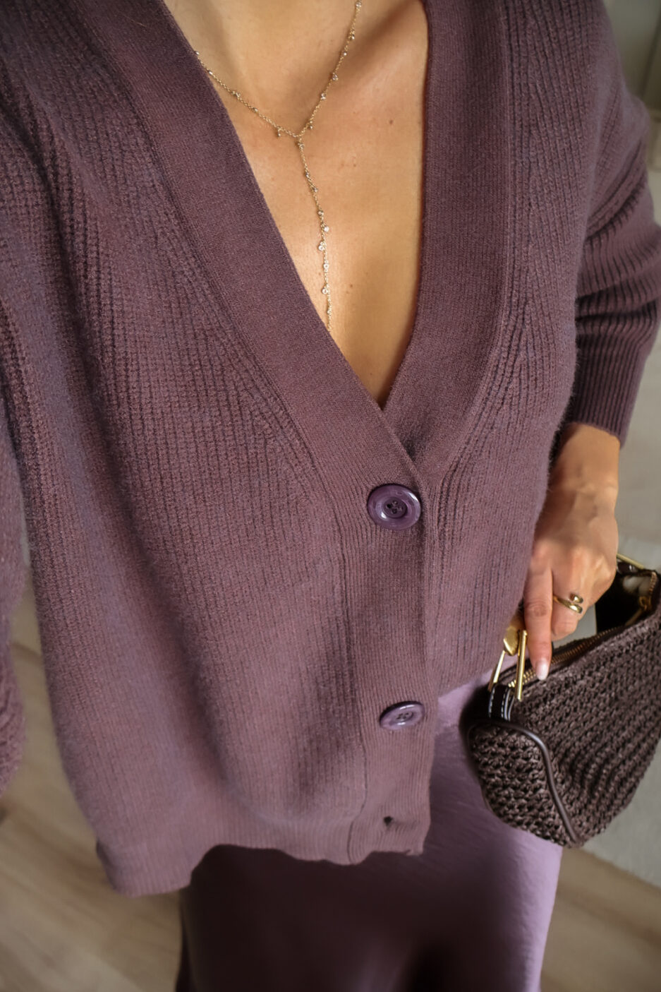 Casaco em malha canelada castanha. Botões à cor. Com elasticidade.