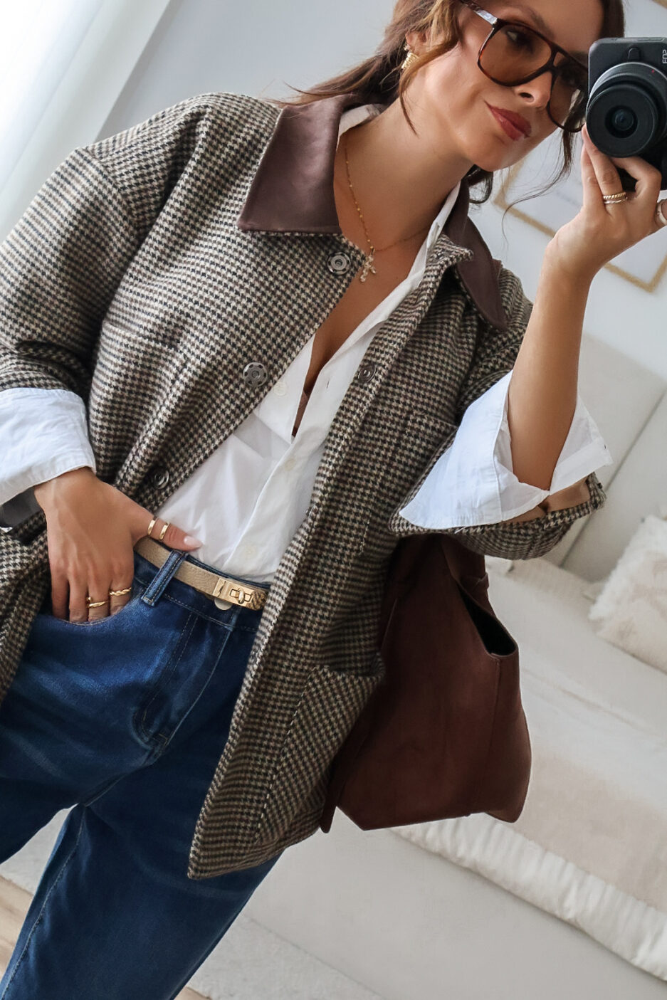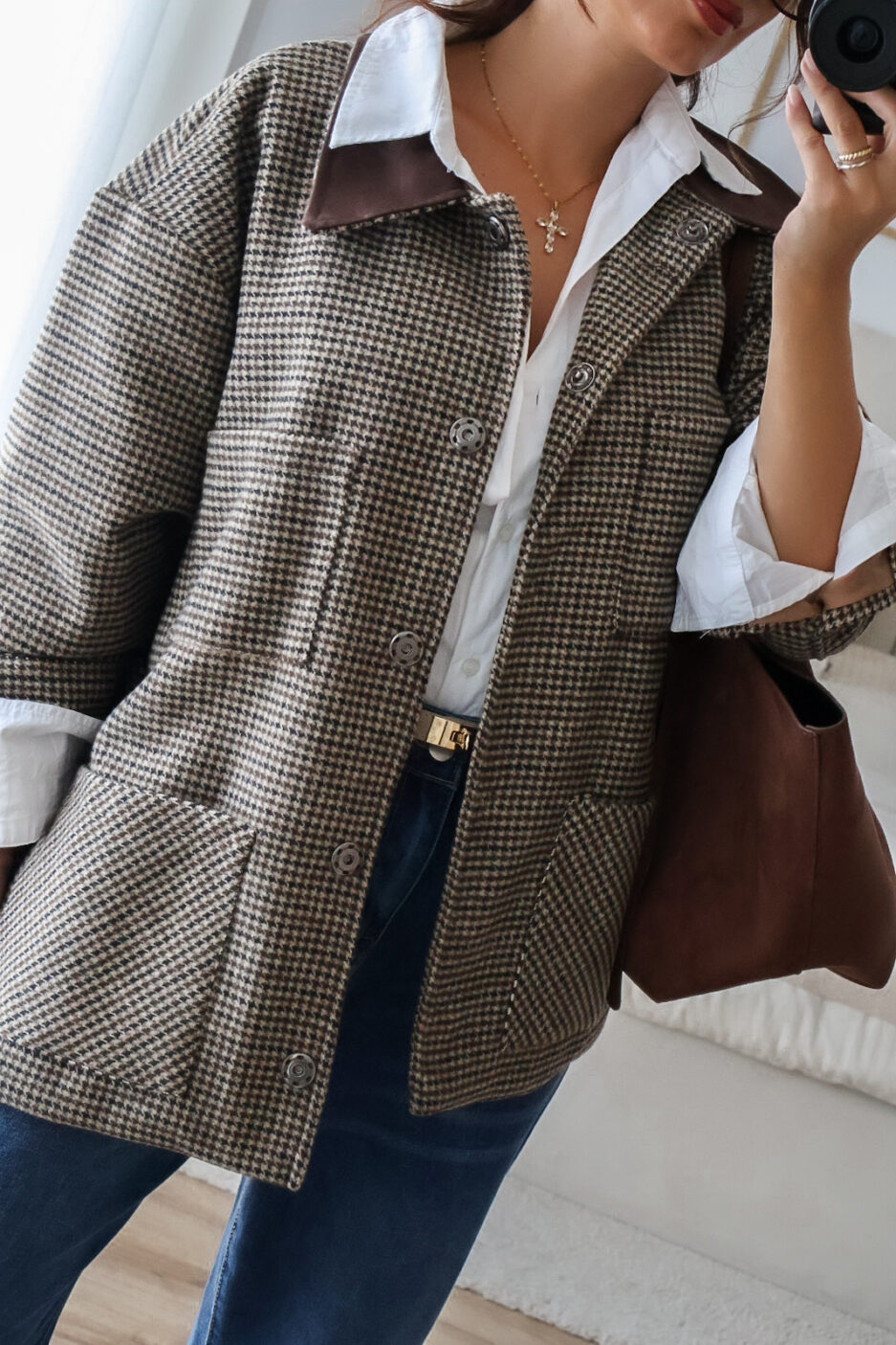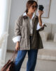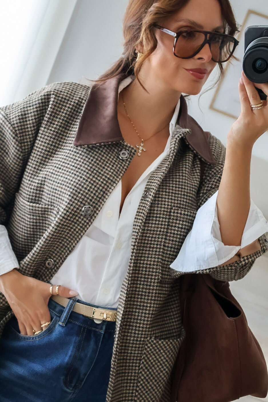 Casaco oversize de lã em tecido pied-de-poule. Tecido com qualidade. Tem bolsos e é todo forrado. Detalhe com gola em camurça castanha.