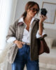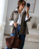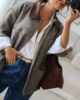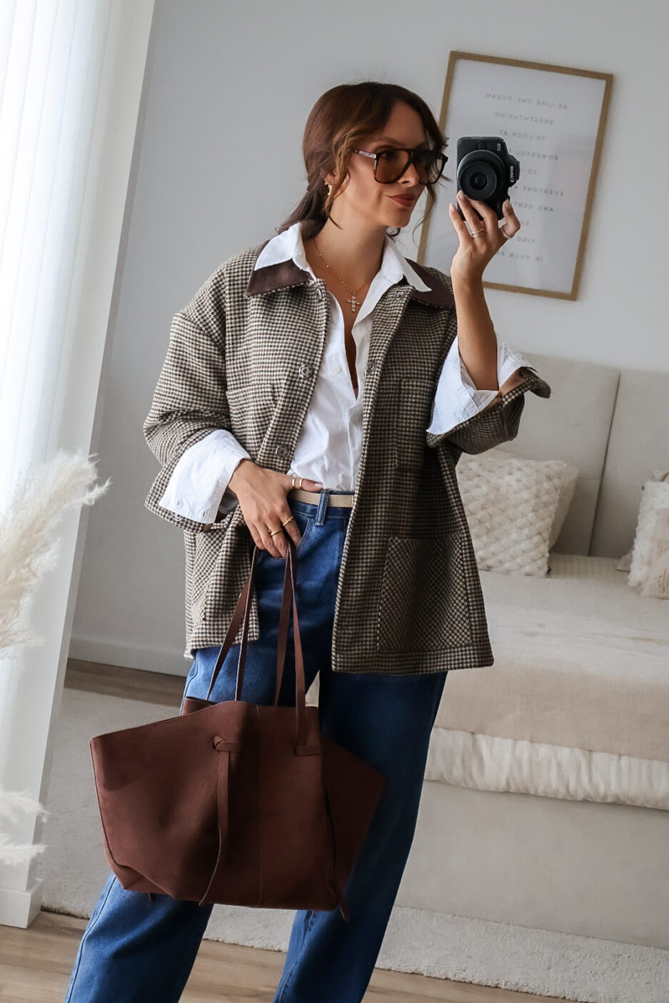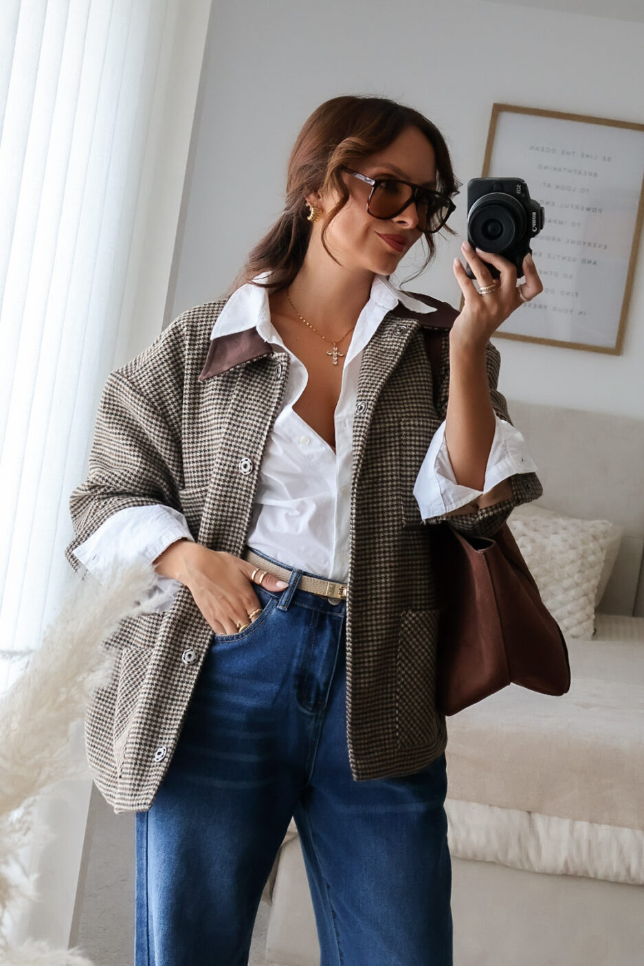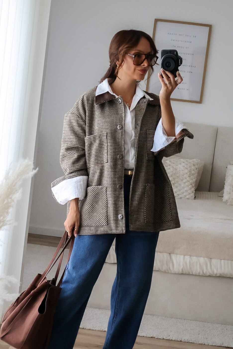 Casaco oversize de lã em tecido pied-de-poule. Tecido com qualidade. Tem bolsos e é todo forrado. Detalhe com gola em camurça castanha.