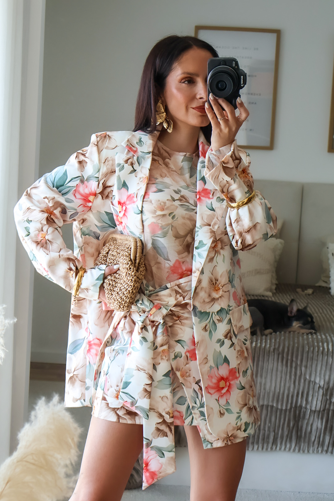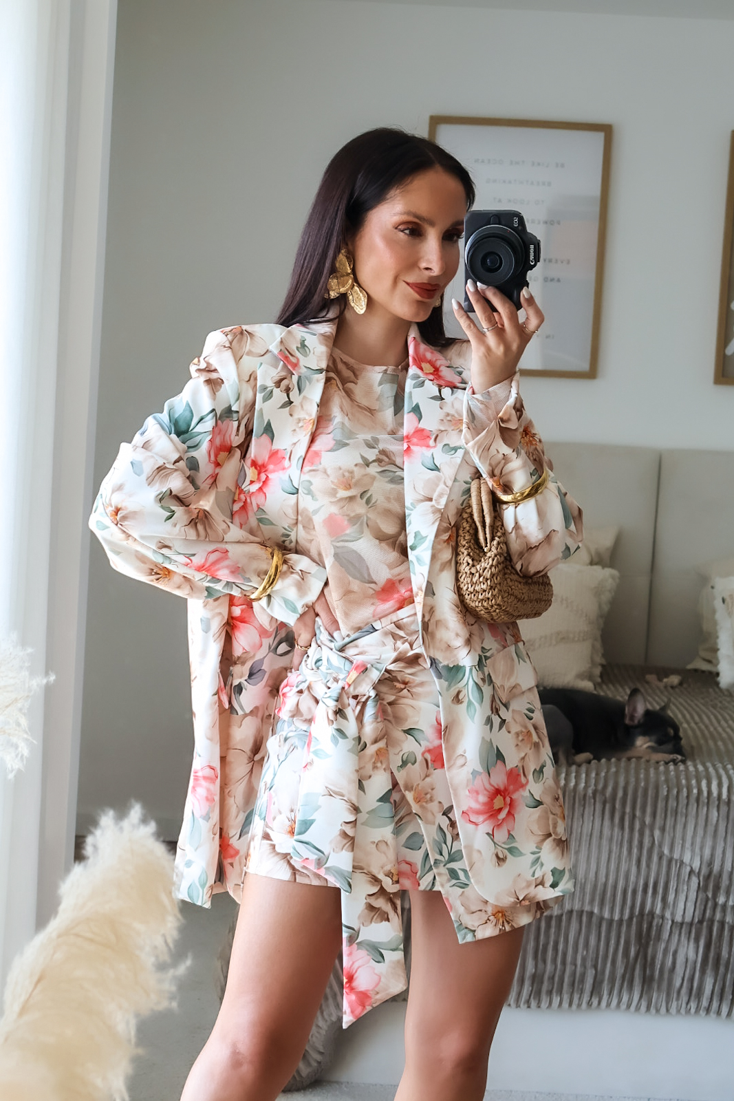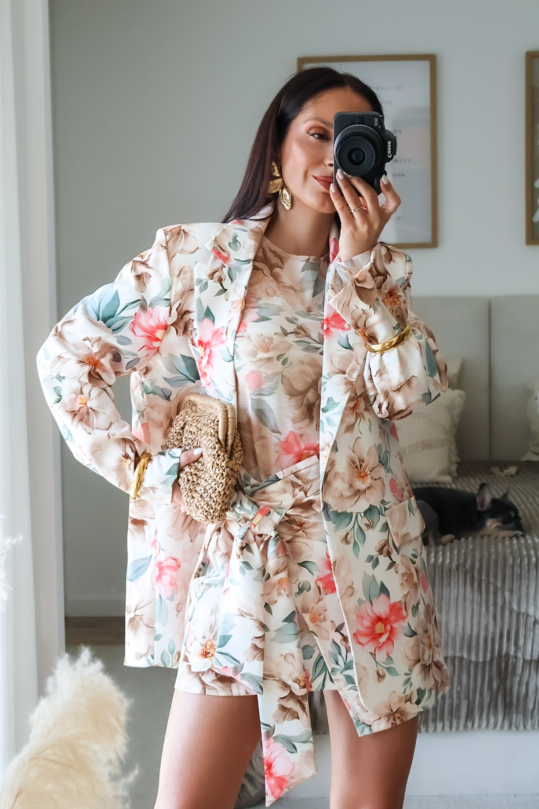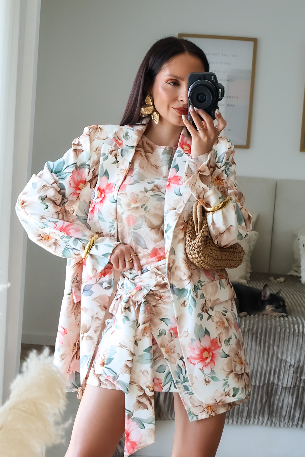 Conjunto composto por blazer e saia. Blazer forrado. Estampado floral.
