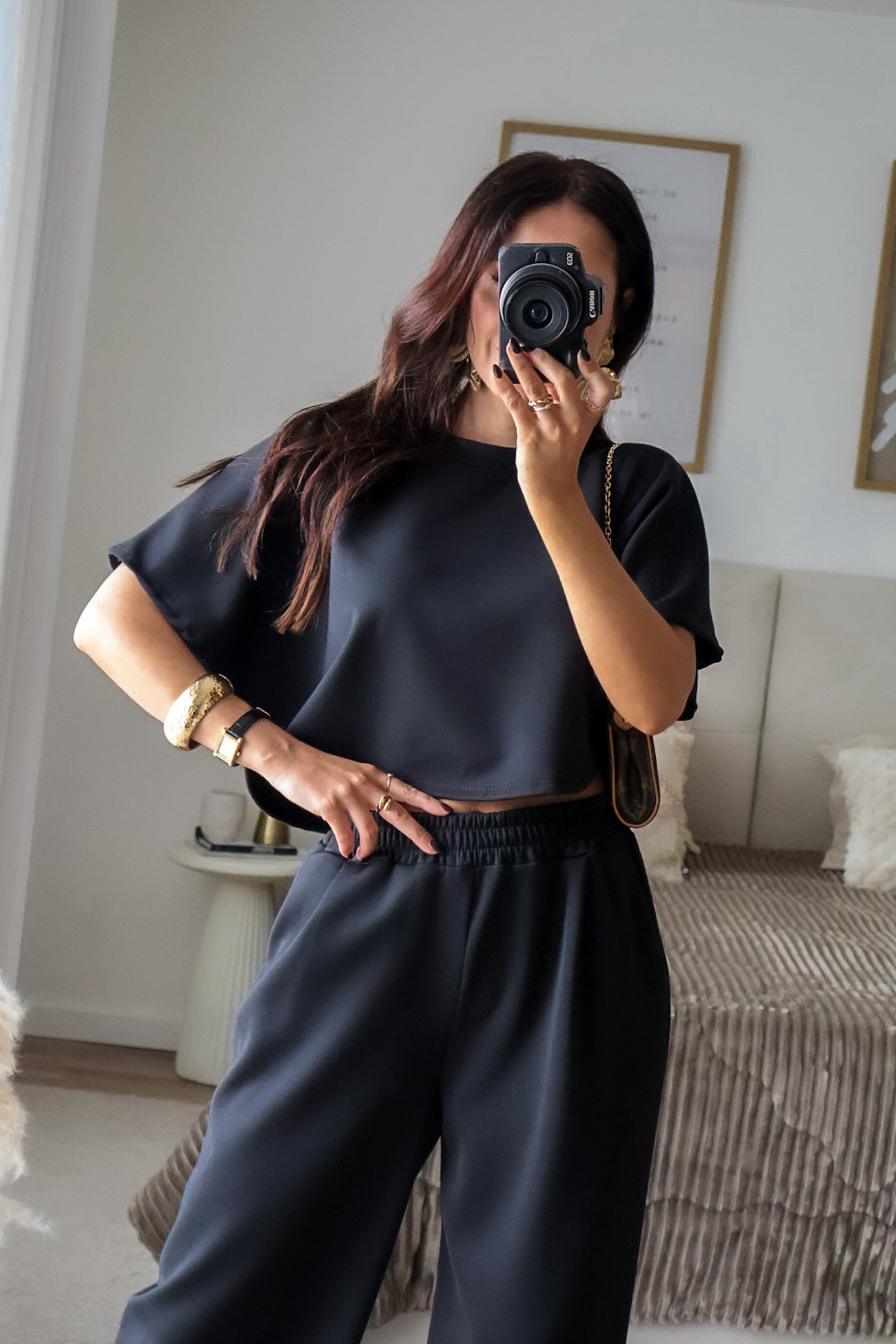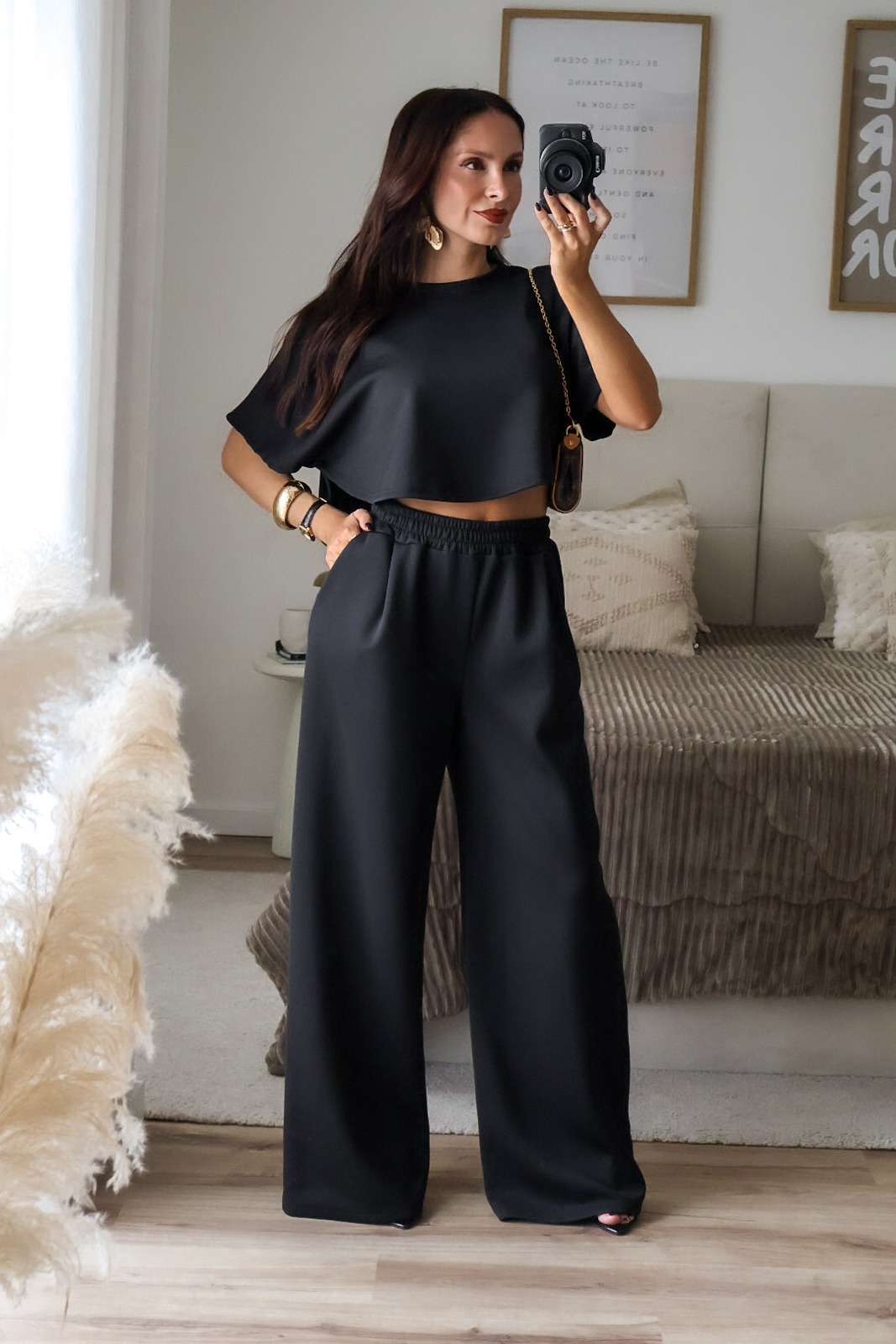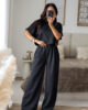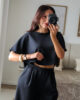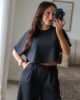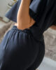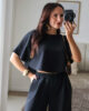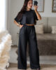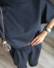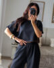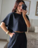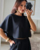 Conjunto prático e versátil, com t-shirt de efeito poncho que valoriza a silhueta. Calças com elástico. Ideal para um look descontraído, mas sempre com estilo.