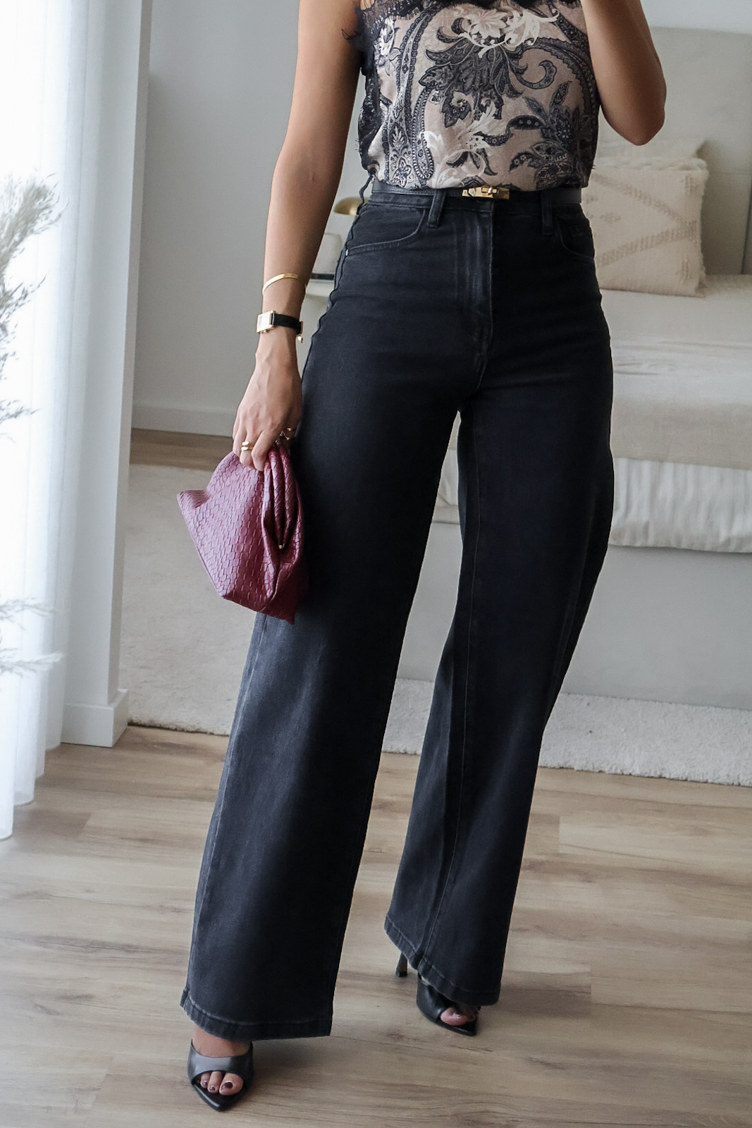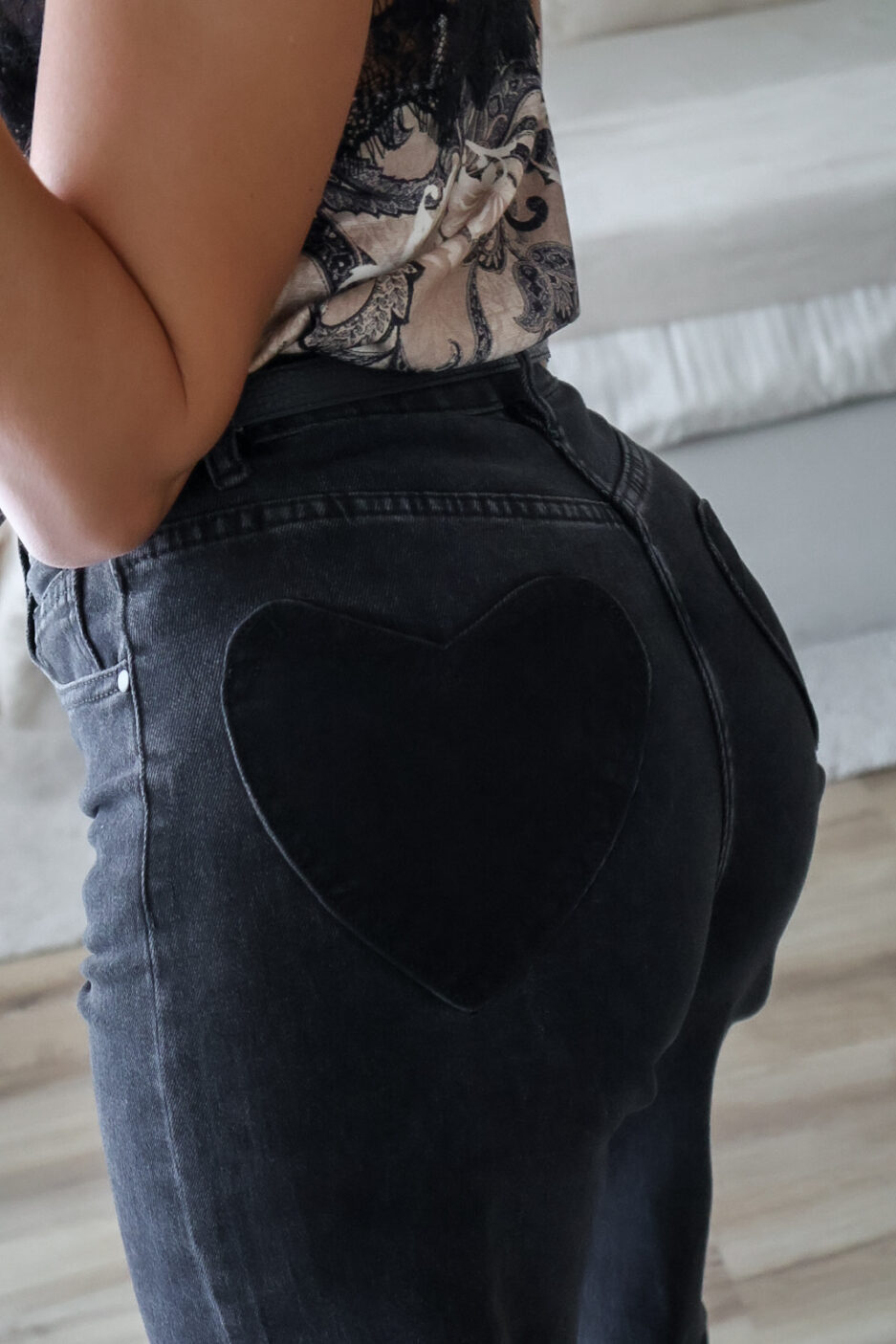 Calças de ganga, modelo wide leg, de cintura subida. Vestem super bem e a ganga é de excelente qualidade. Têm detalhe, atrás, de bolsos em formato de coração o que acaba por valorizar a silhueta. Com elasticidade para maior conforto. Se preferirem mais largo, escolham o tamanho acima.