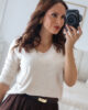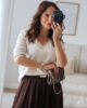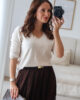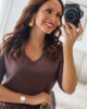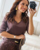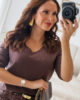 Malha de manga comprida com decote em bico e com elasticidade. Malha macia.