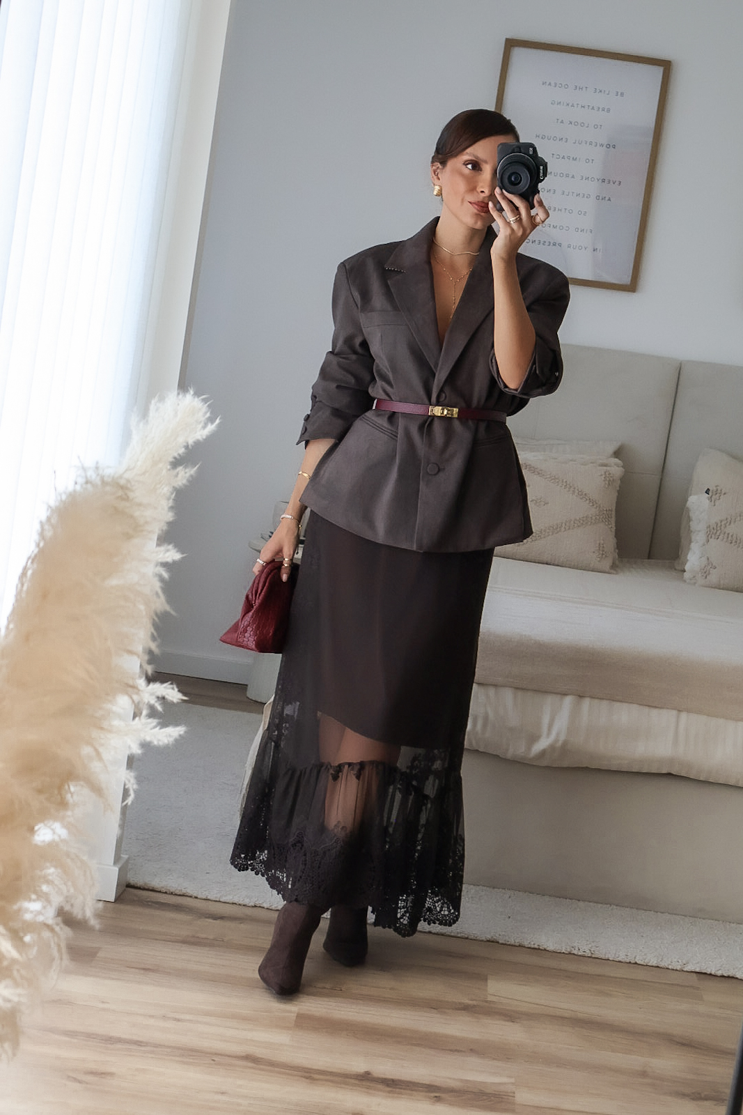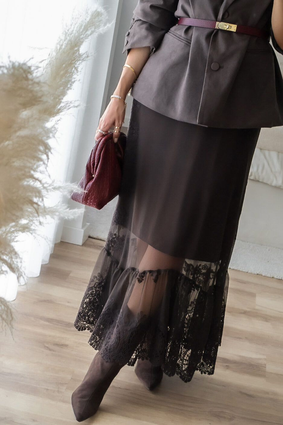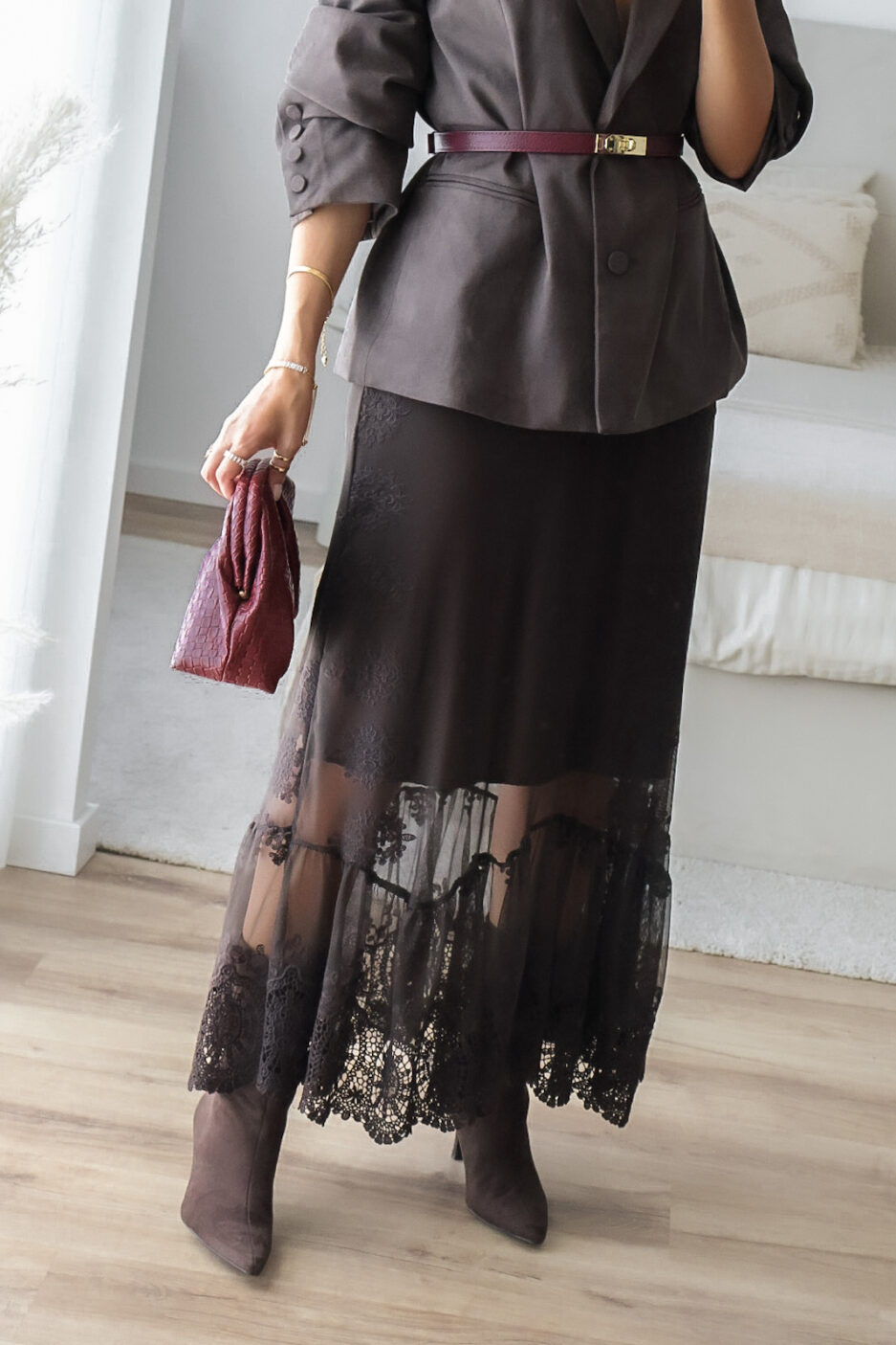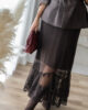 Saia midi em renda de alta qualidade. A saia tem forro e elástico na cinta. Tem alguns detalhes de bordados em baixo.