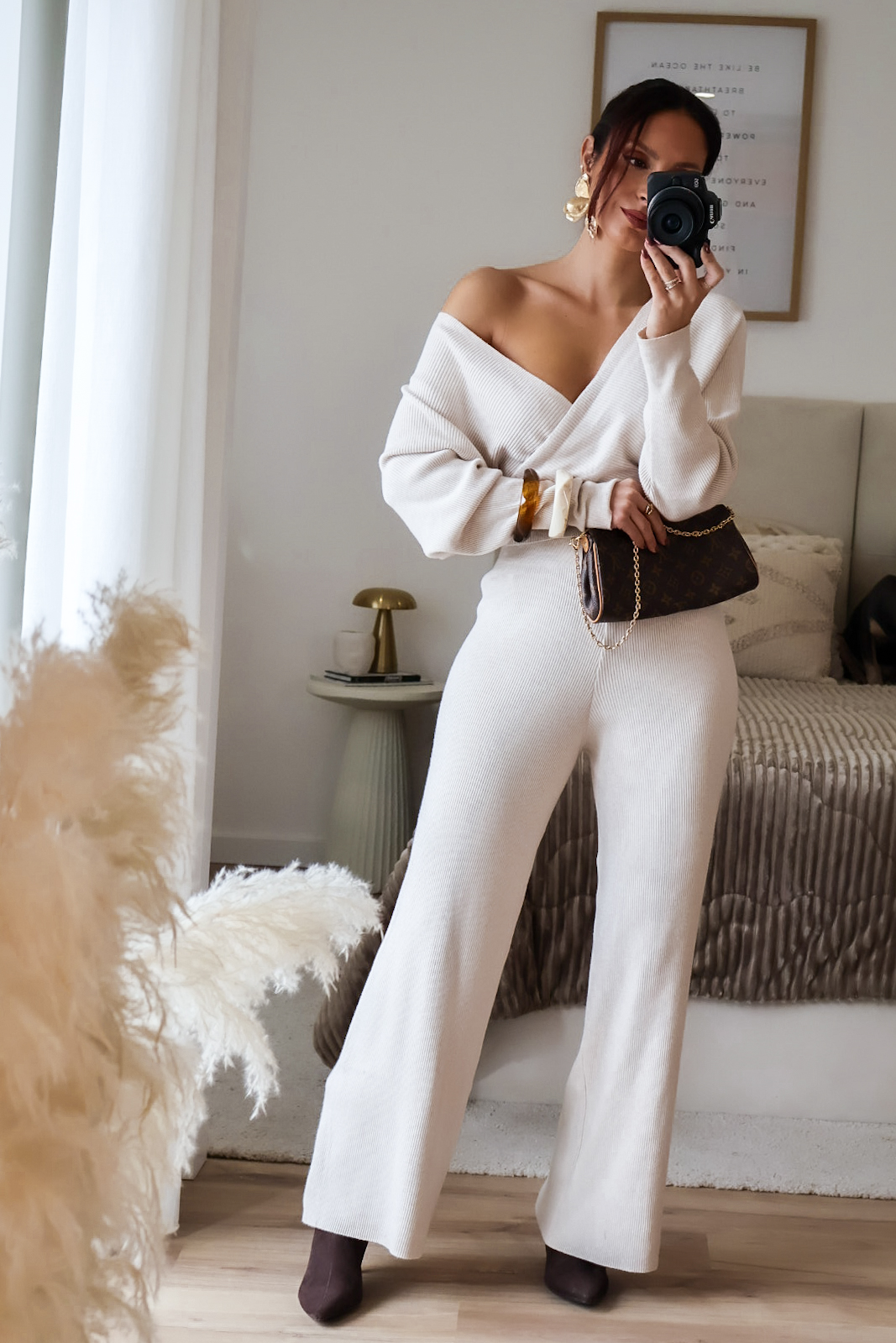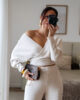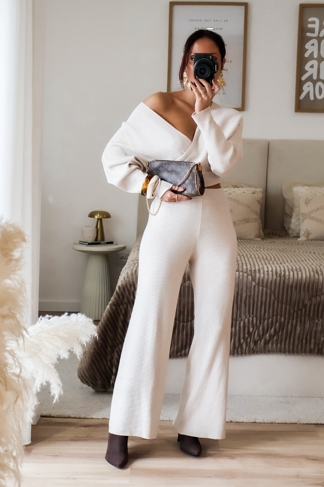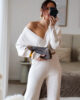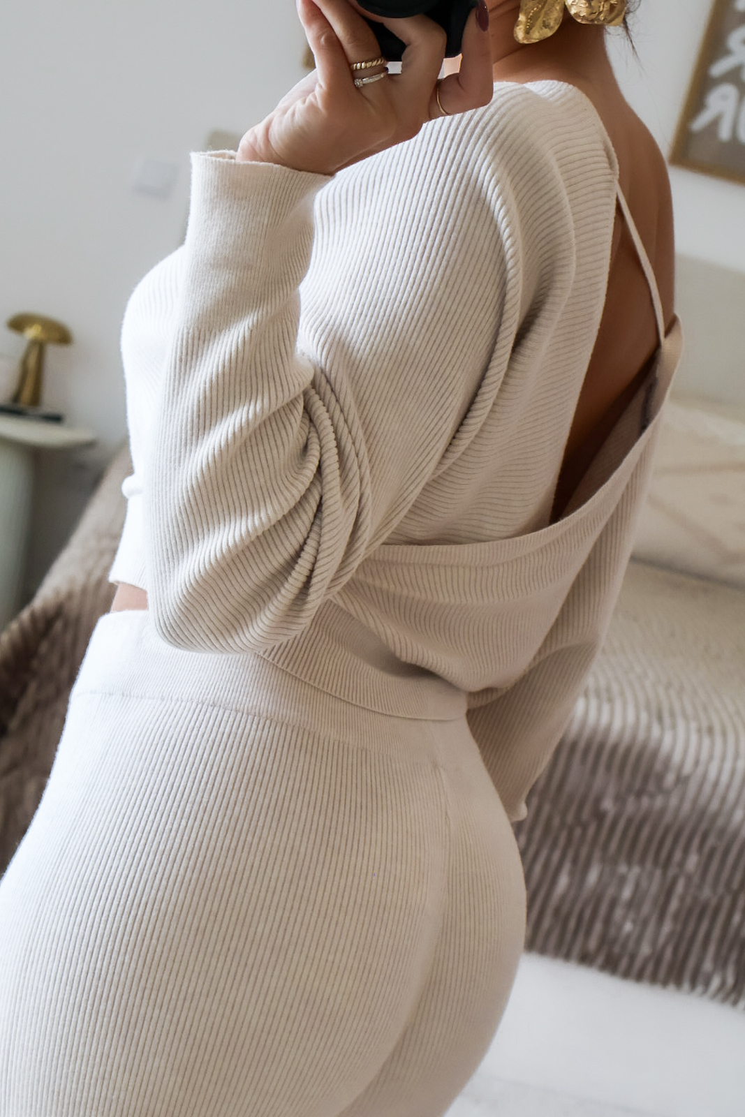 Conjunto em malha composto por camisola e calças. As calças são modelo crop e têm elástico na cinta. Tecido macio e com elasticidade.