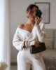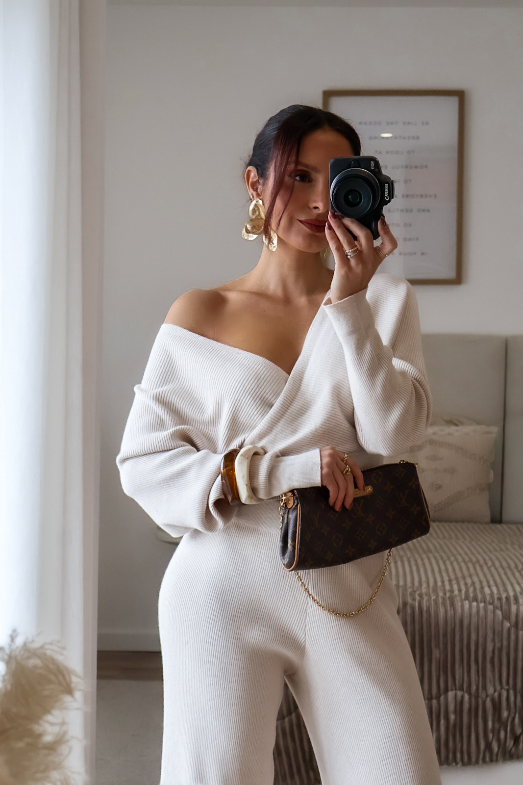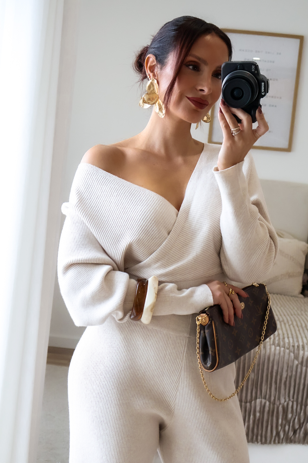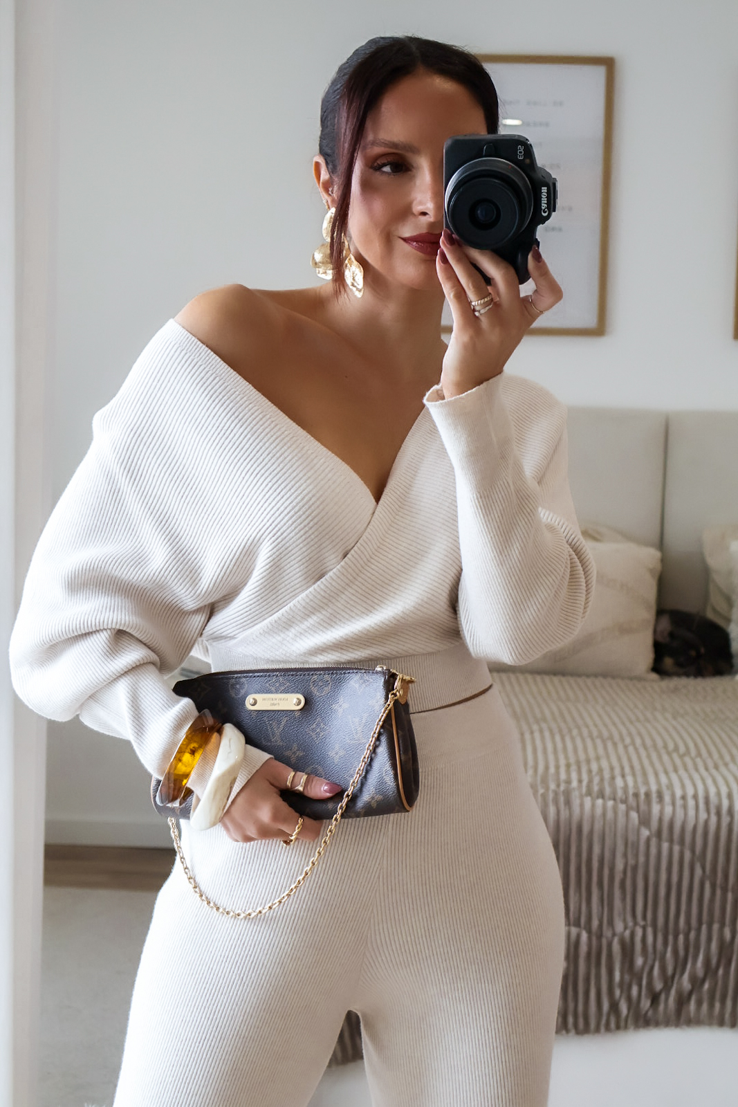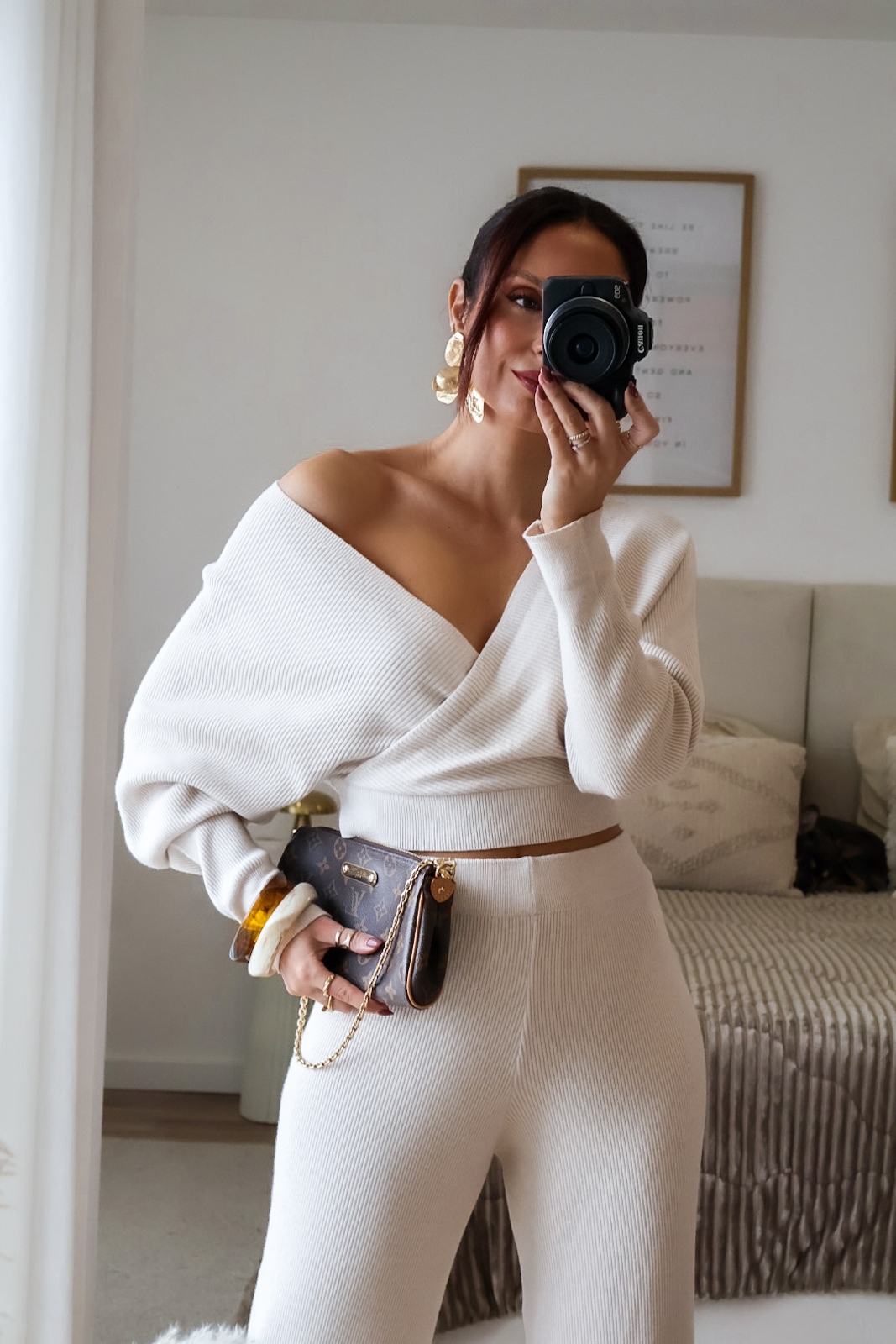 Conjunto em malha composto por camisola e calças. As calças são modelo crop e têm elástico na cinta. Tecido macio e com elasticidade.