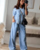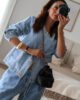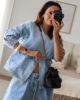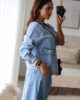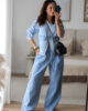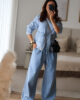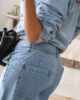 Conjunto de ganga composto por casaco e calças. Ganga de ótima qualidade. Traz cinto em ganga incluido. Detalhe de botões dourados. Calças compridas, o que serve perfeitamente a pessoas altas também. Modelo largo de calças. Não aconselho a quem vestir XS/S ou 34/36, a não ser que goste de calças mais descidas (como é o caso da modelo).