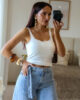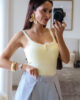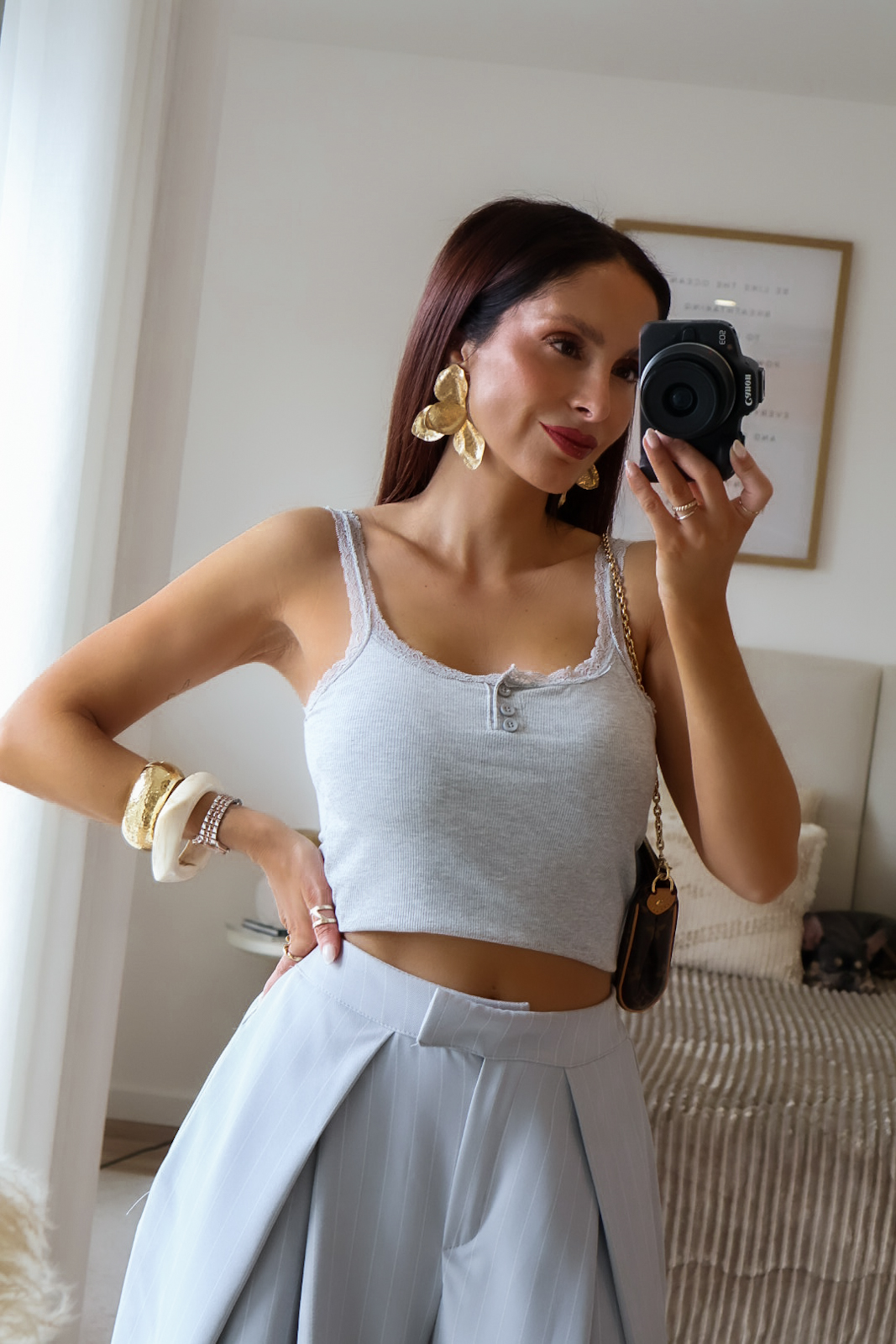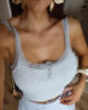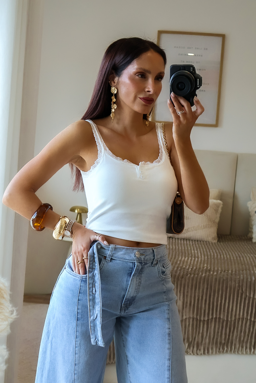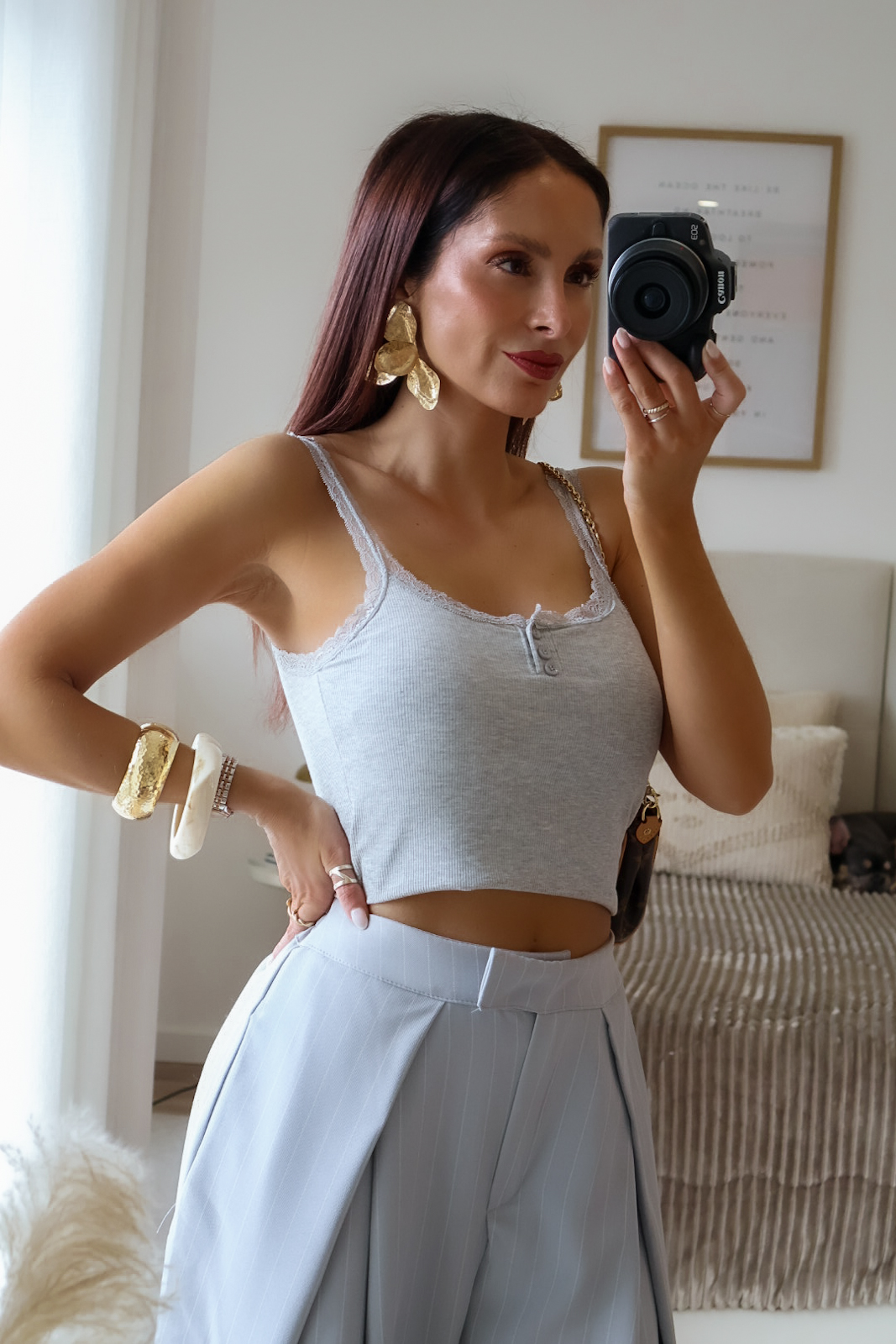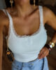 Top básico com elasticidade e detalhe em renda. Tecido macio. Traz copas.