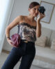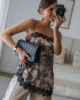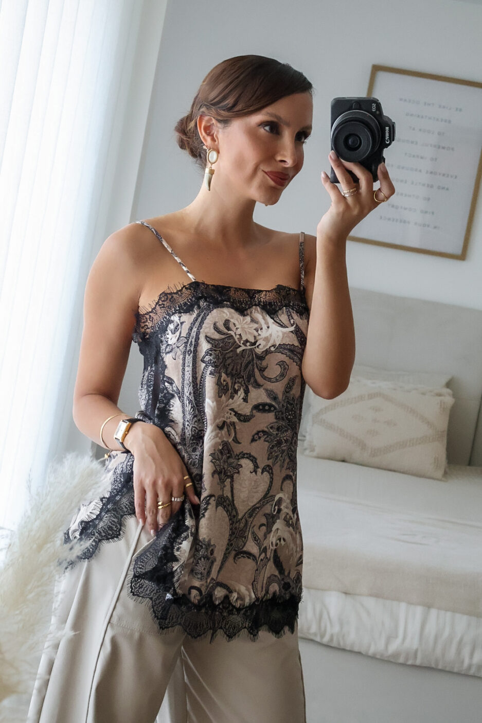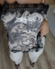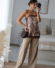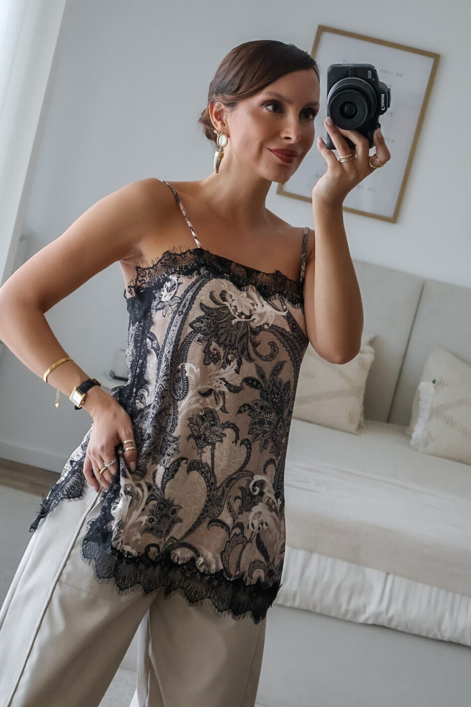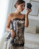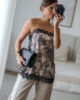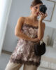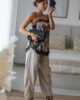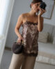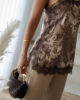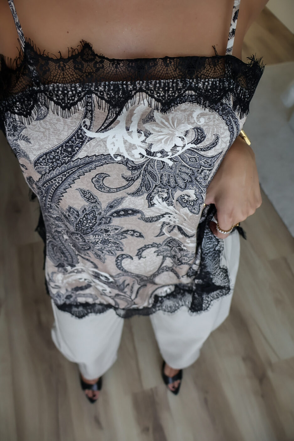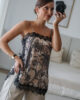 Top estampado que combina tecido aveludado com detalhes em renda. Tem alças finas e aberturas nas laterais inferiores.