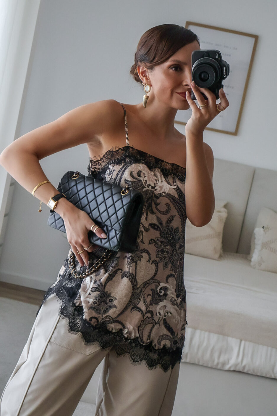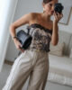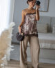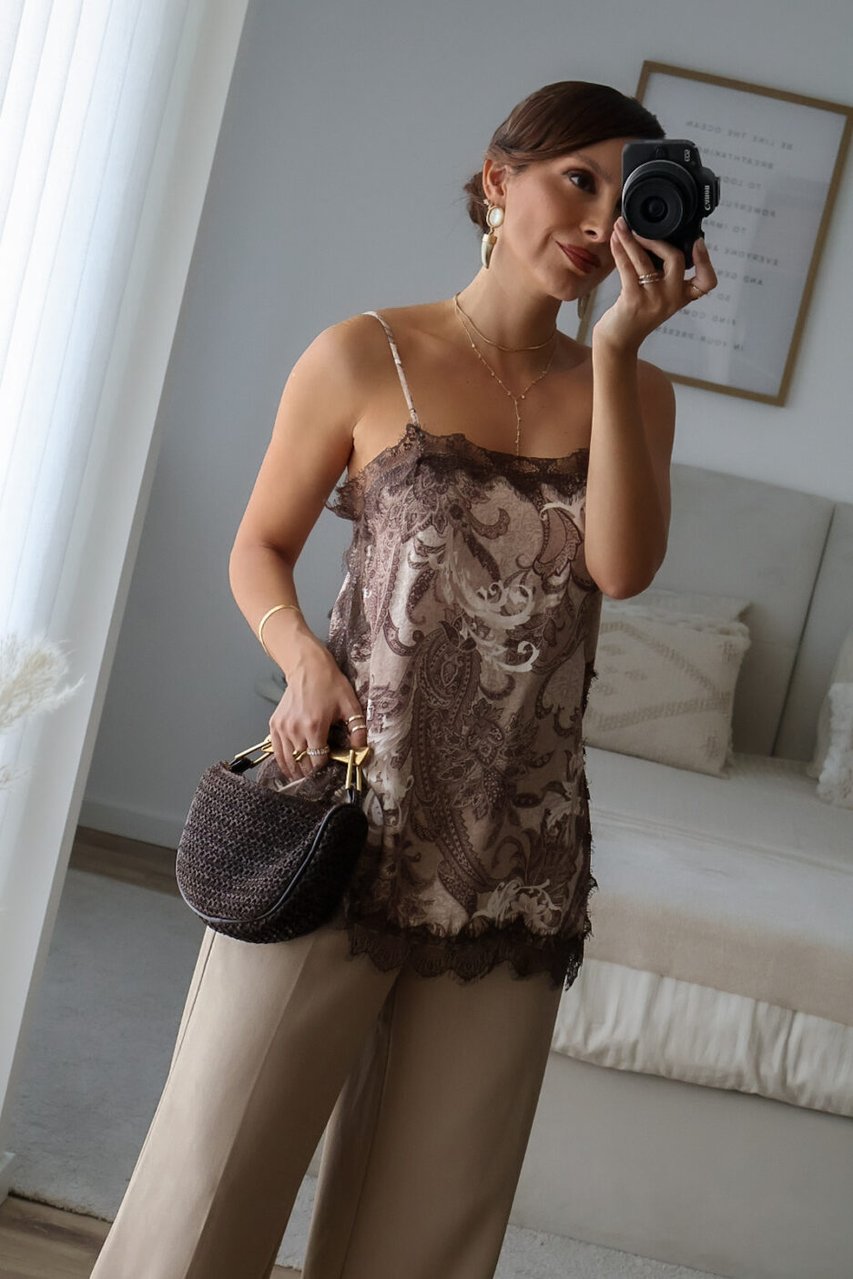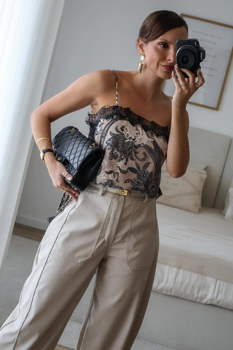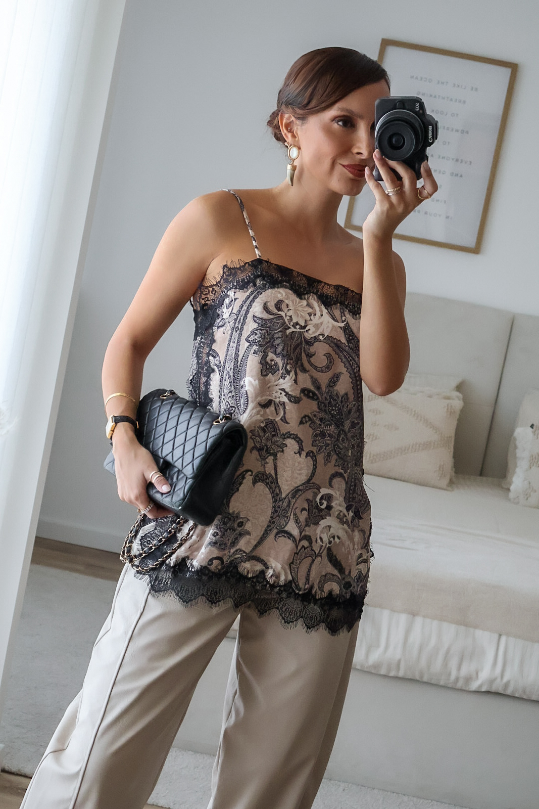 Top estampado que combina tecido aveludado com detalhes em renda. Tem alças finas e aberturas nas laterais inferiores.