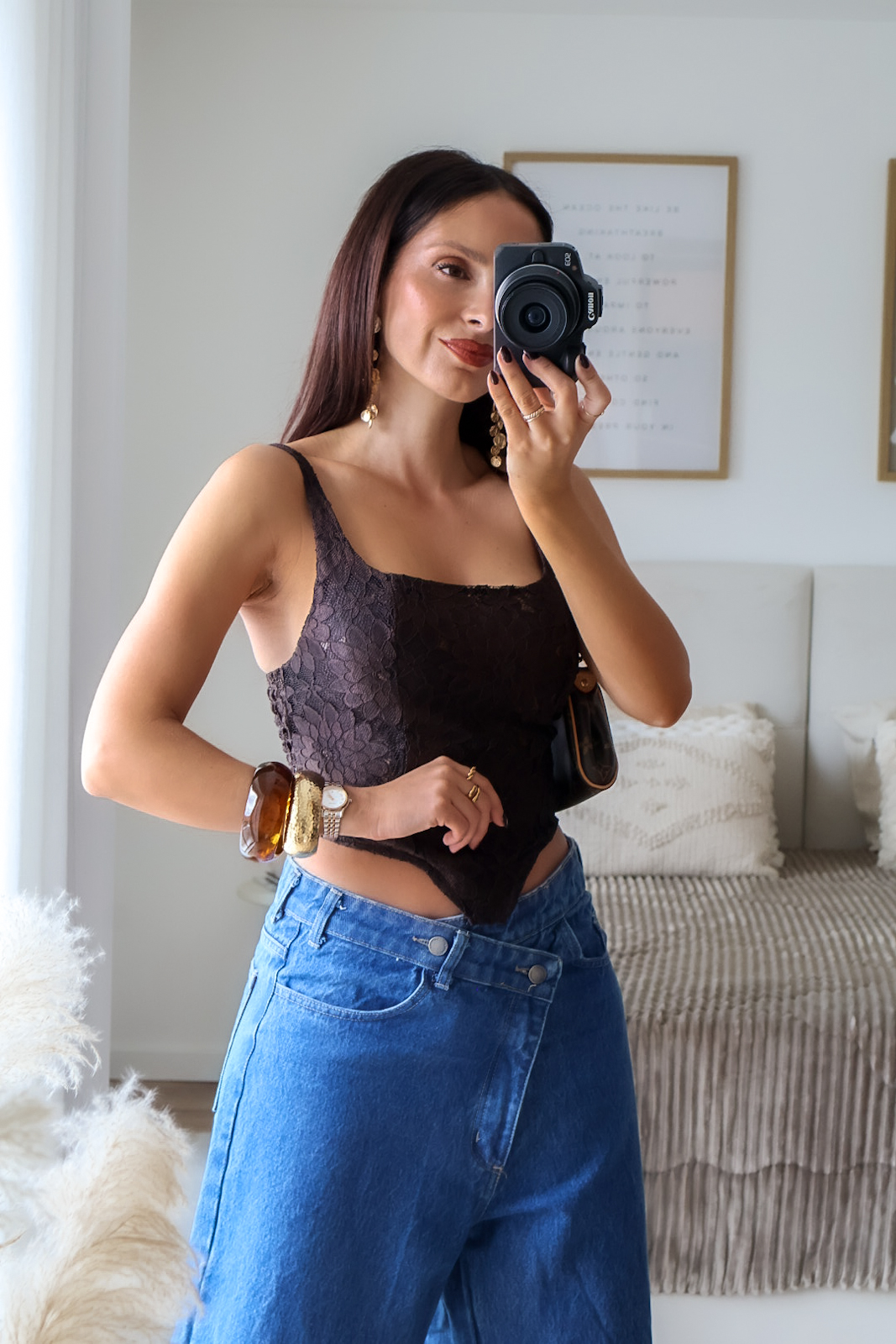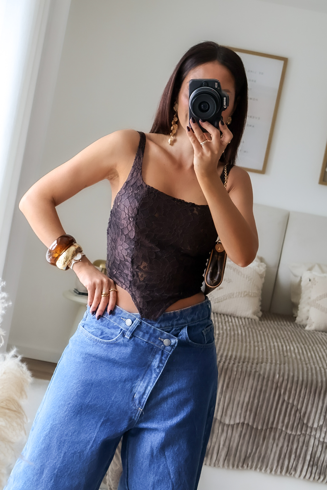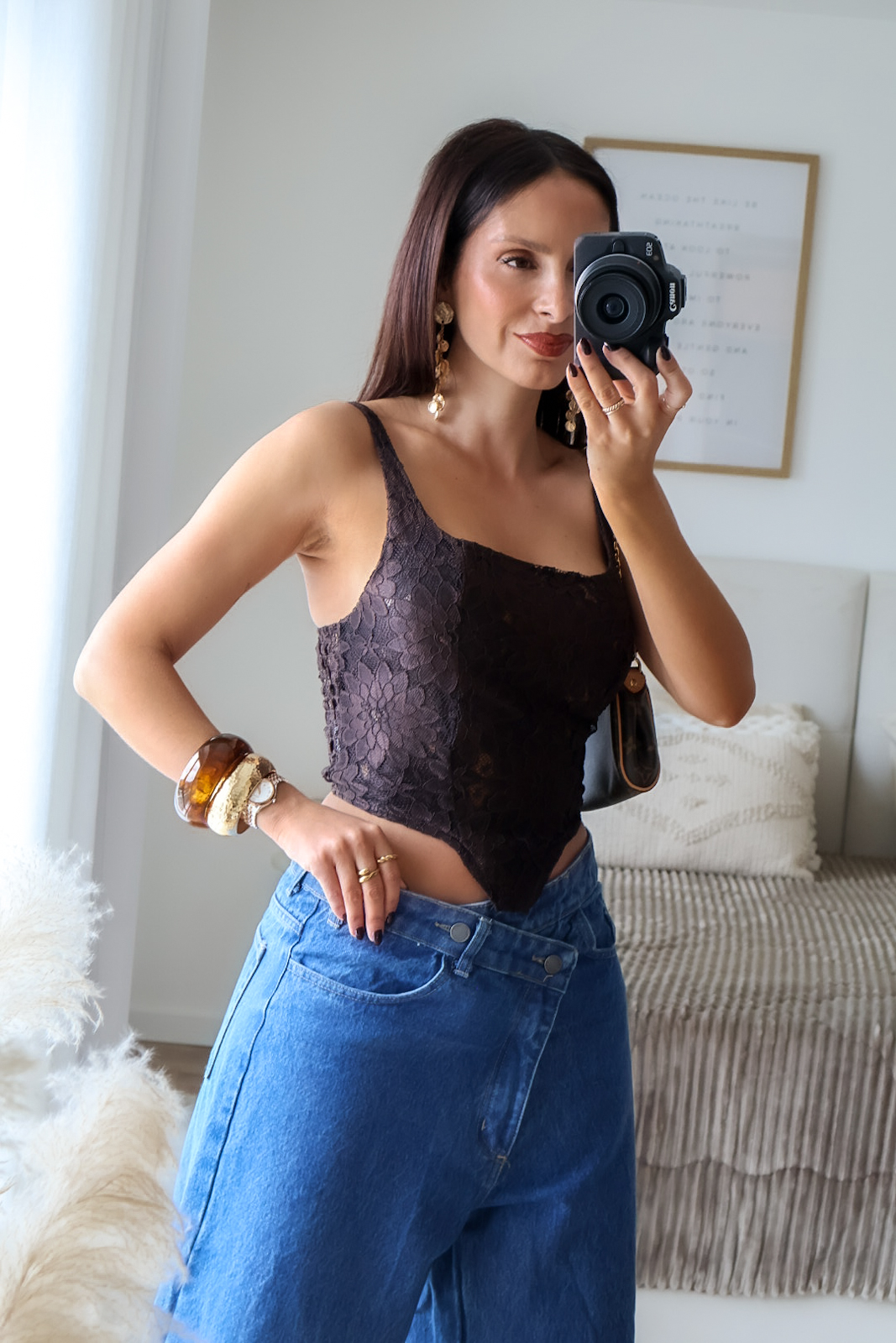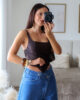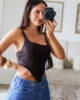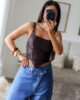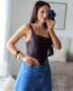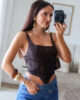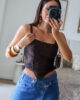 Top rendado com corte estilo corpete, que valoriza a silhueta de forma elegante e confortável. Tem alguma elasticidade.