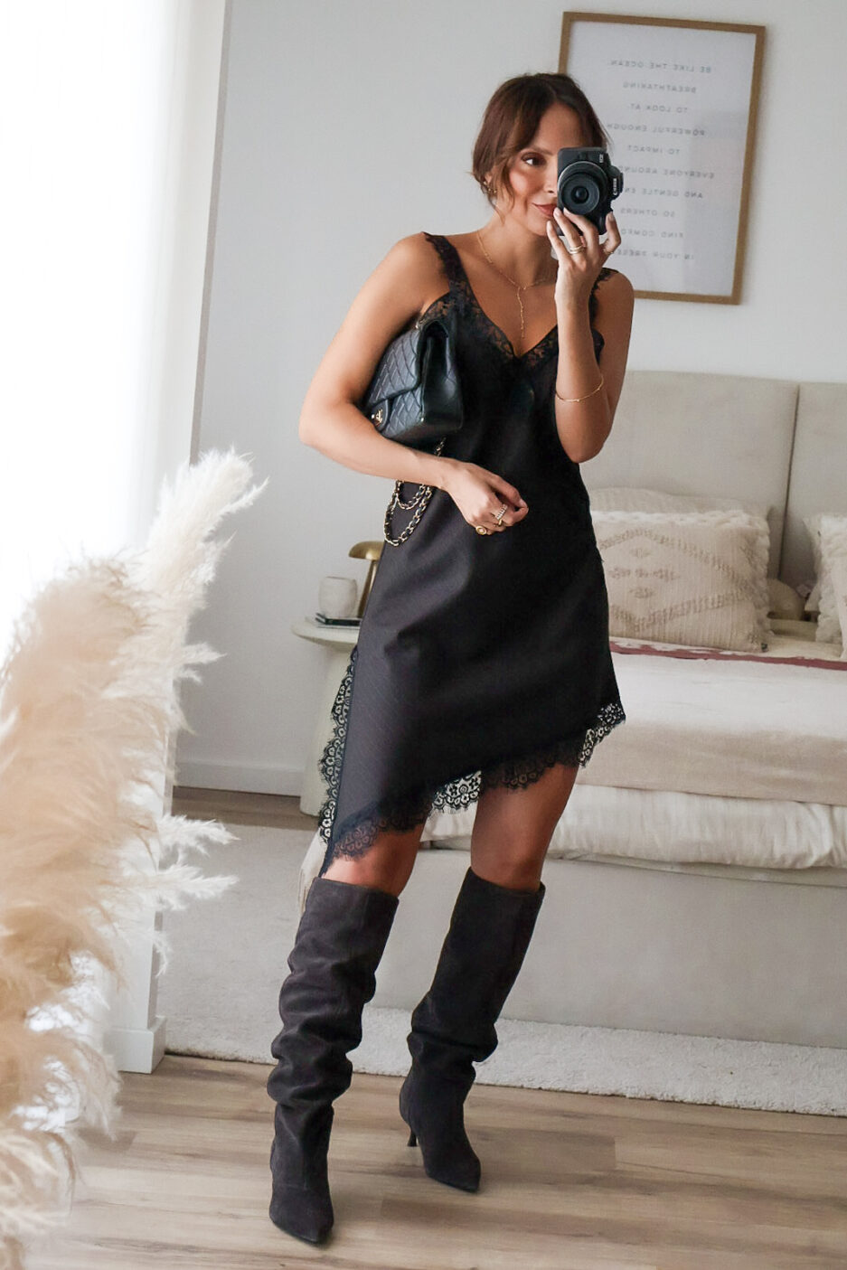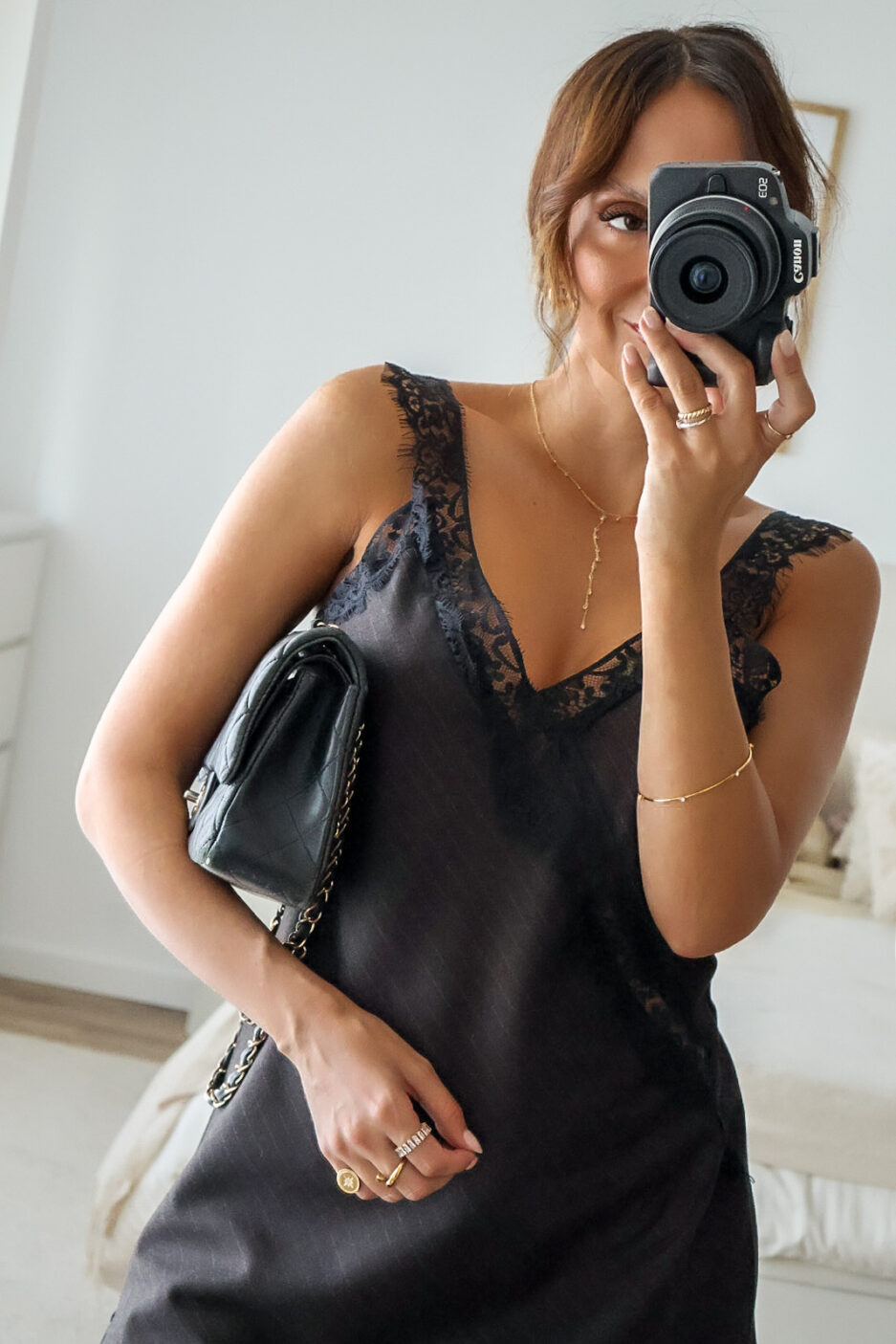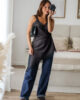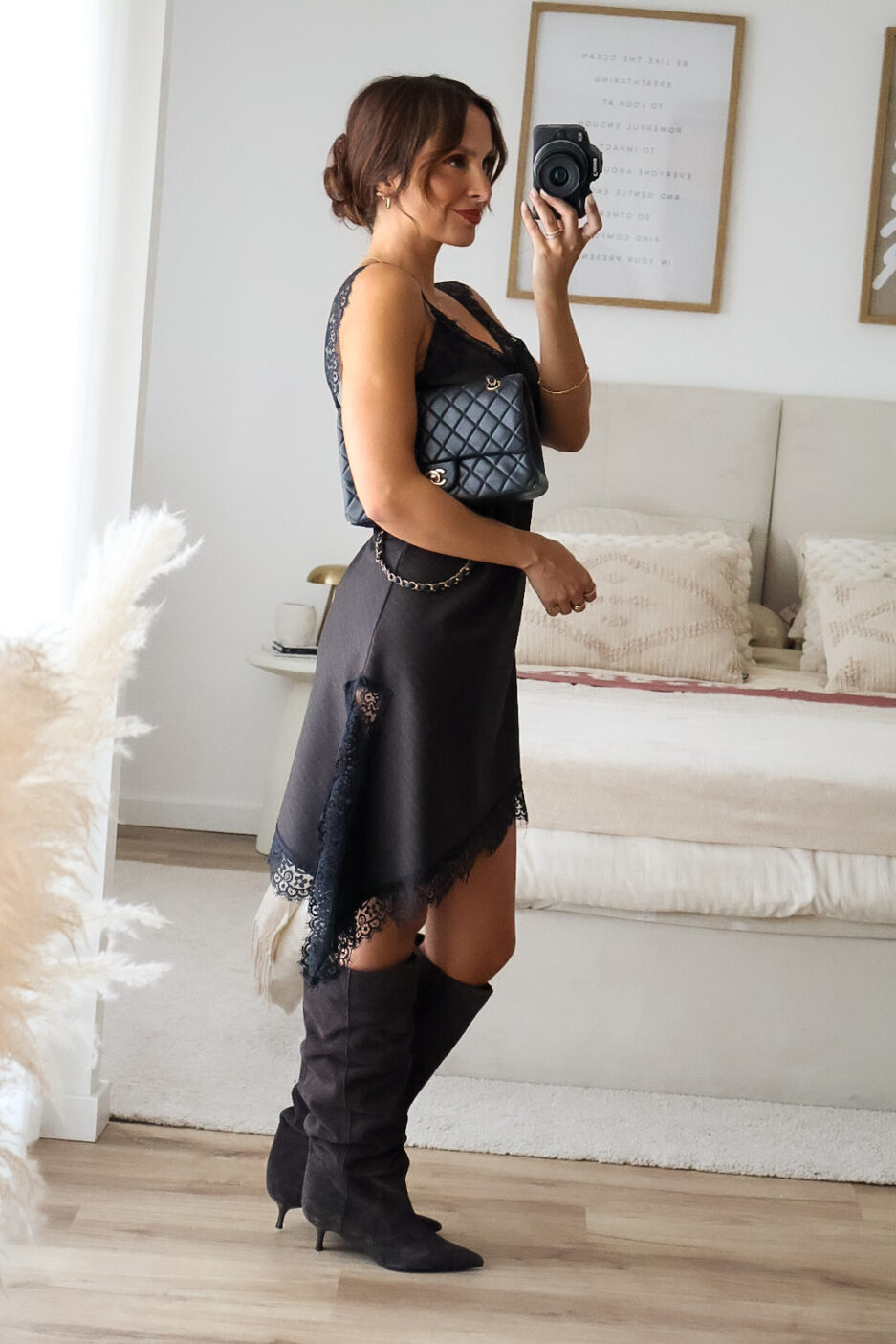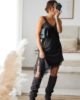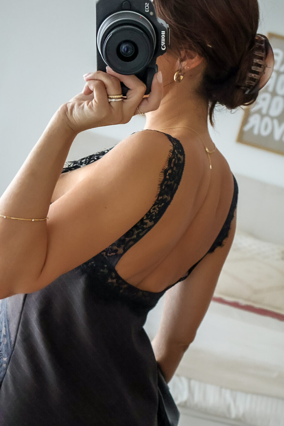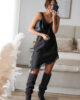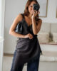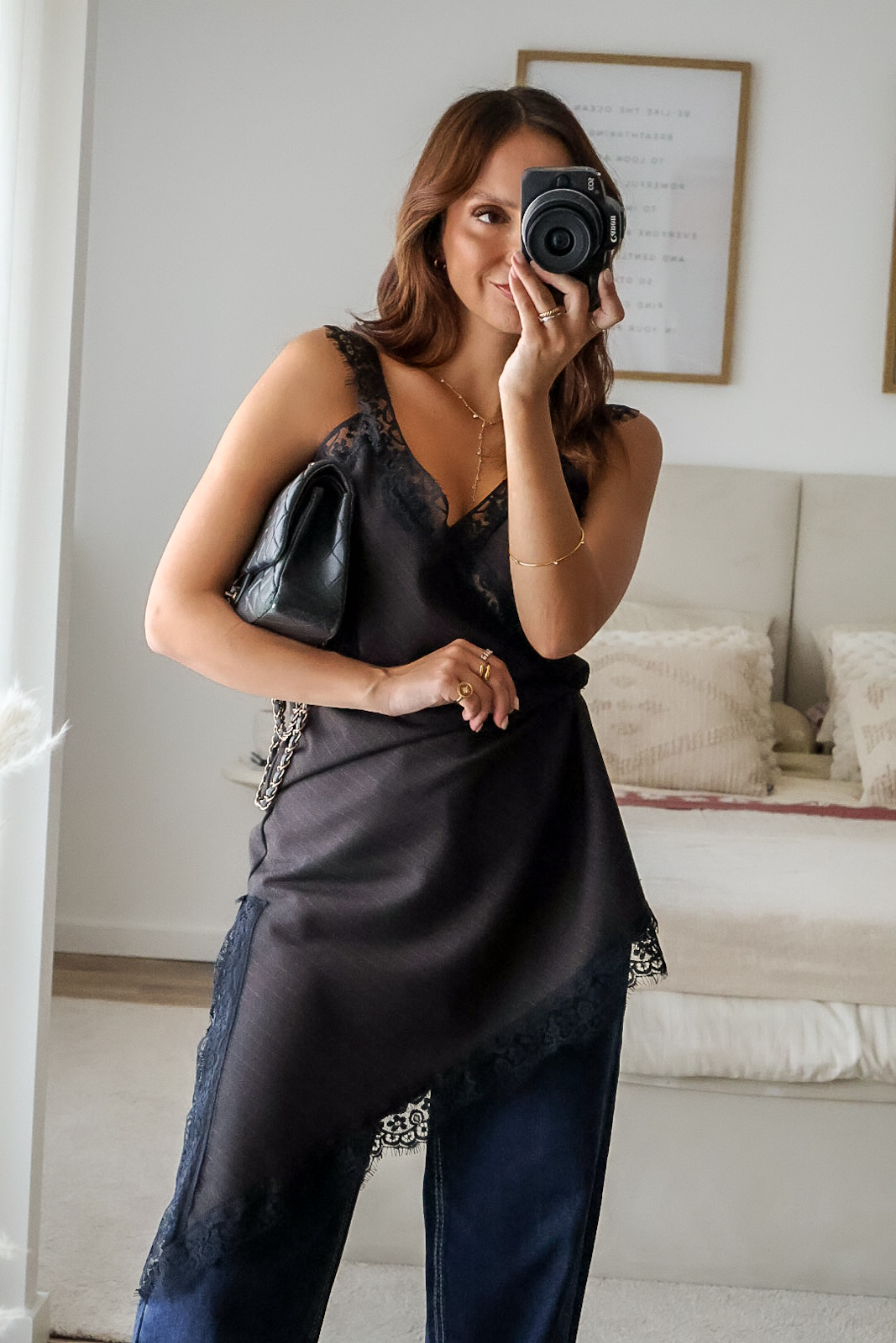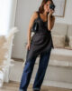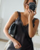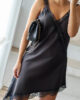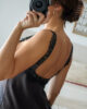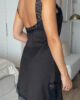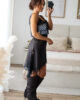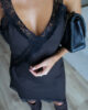 Top que também pode ser usado como vestido com detalhes em renda. Tem corte assimétrico e abertura na lateral inferior.