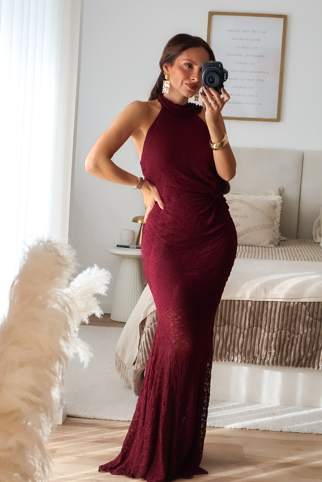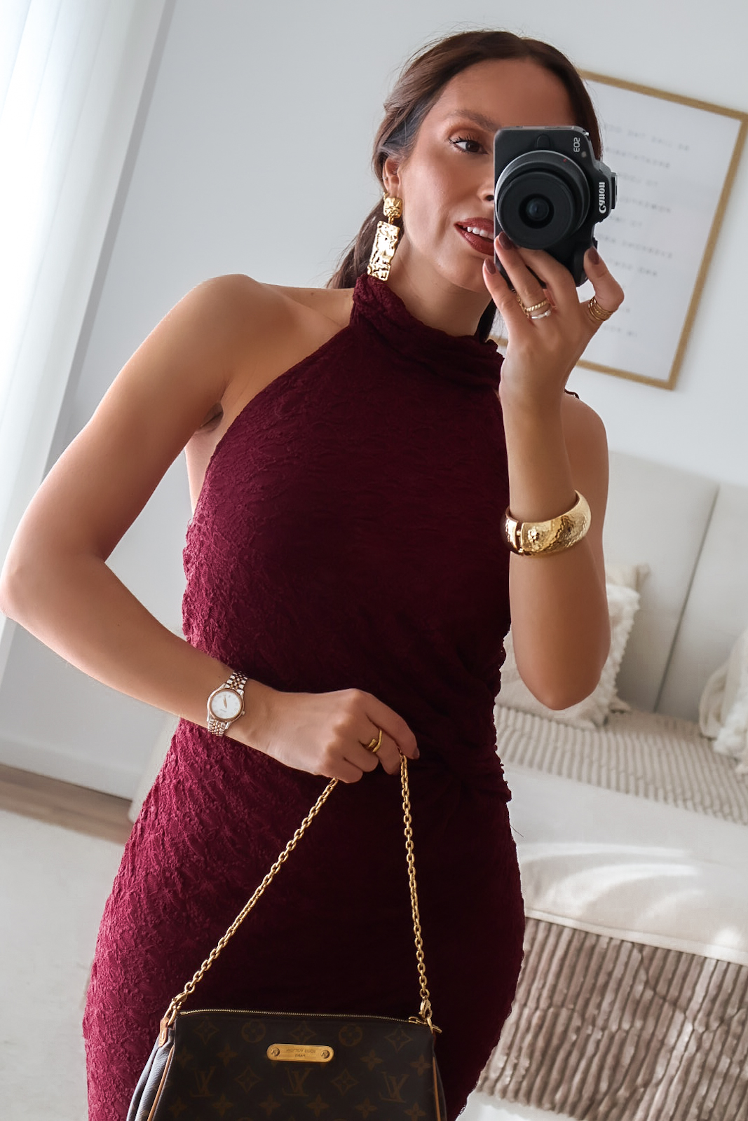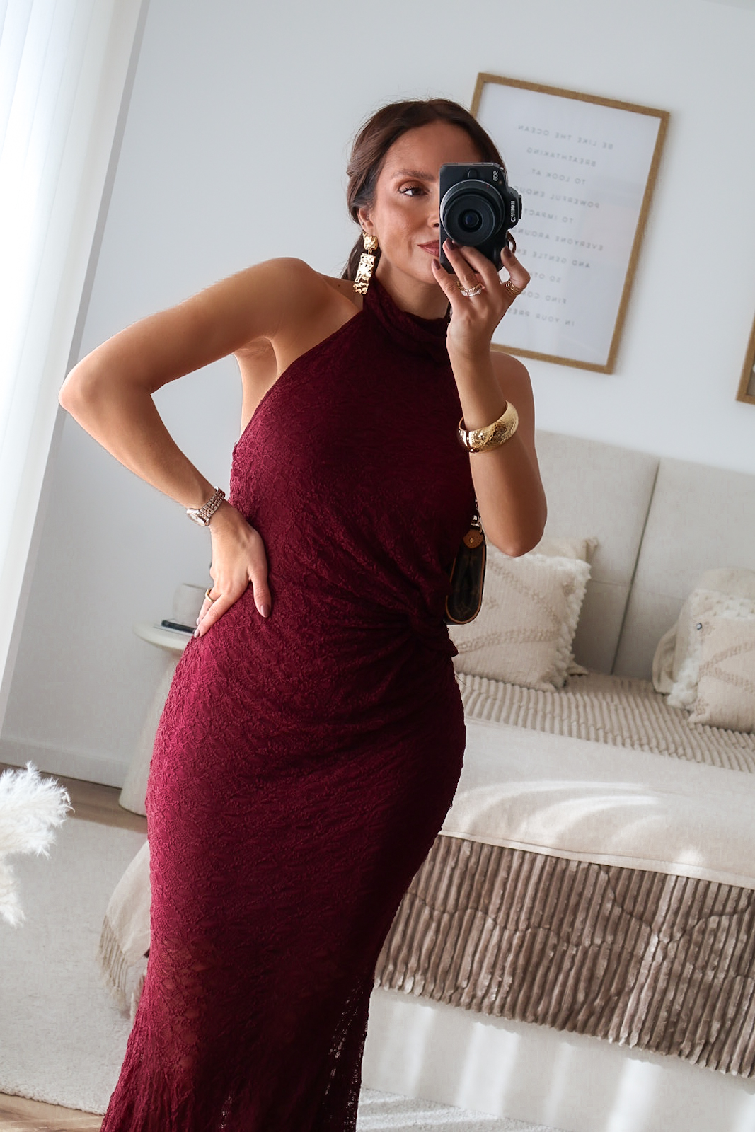 Vestido em renda longo com drapeado na parte abdómen. Tem elasticidade. Um modelo elegante e versátil.