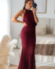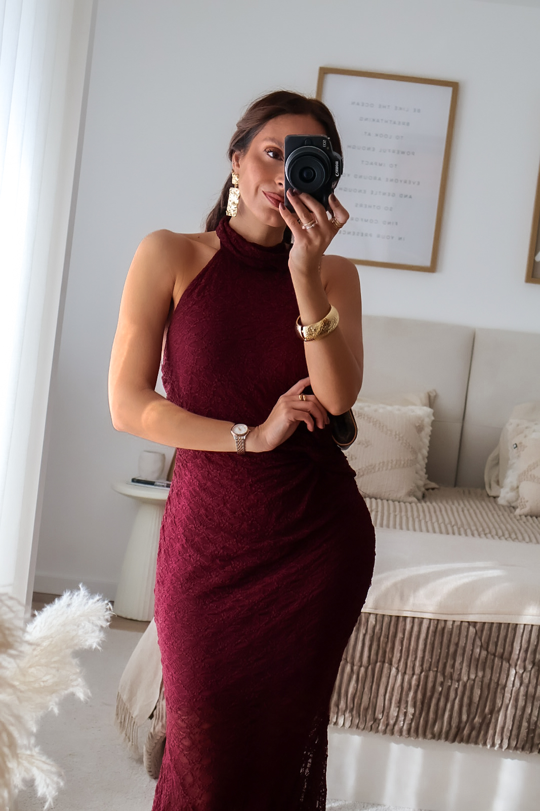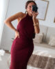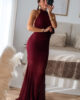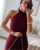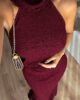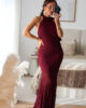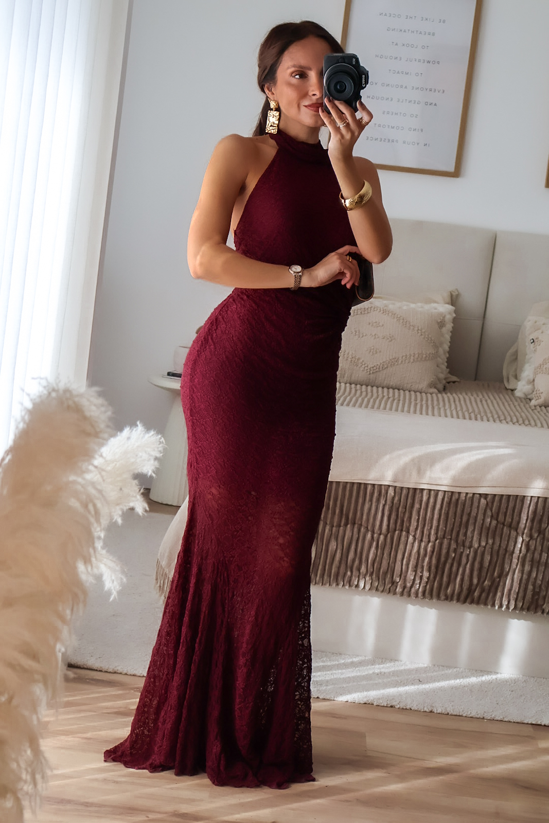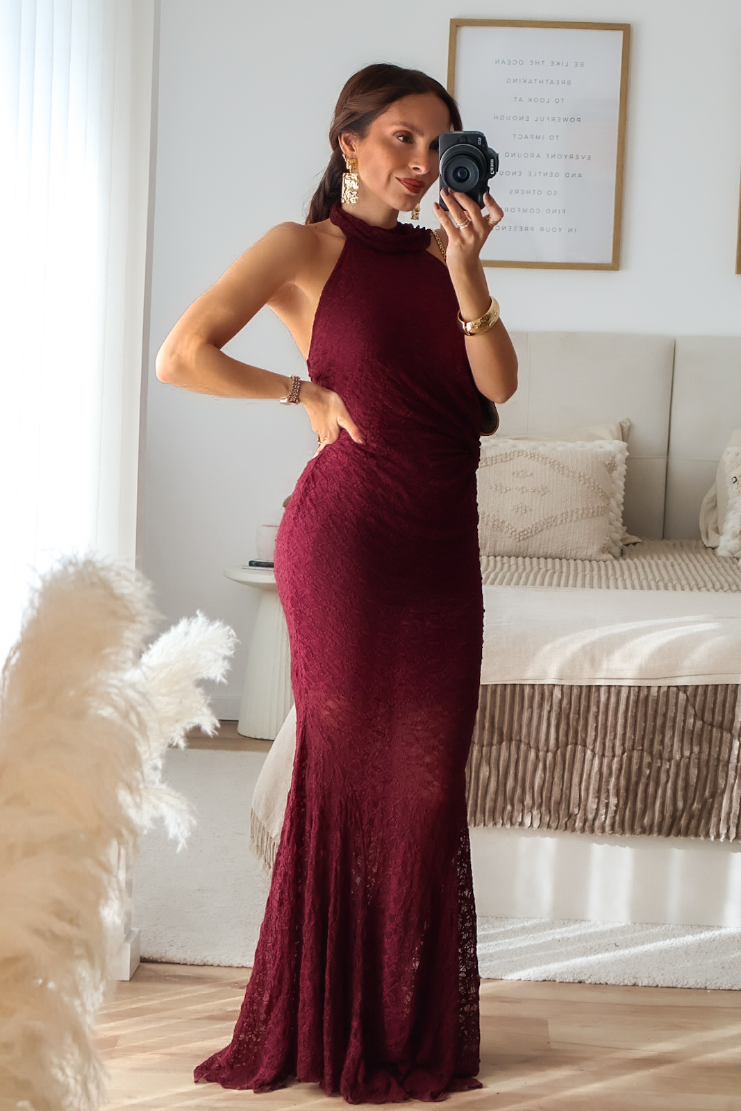 Vestido em renda longo com drapeado na parte abdómen. Tem elasticidade. Um modelo elegante e versátil.